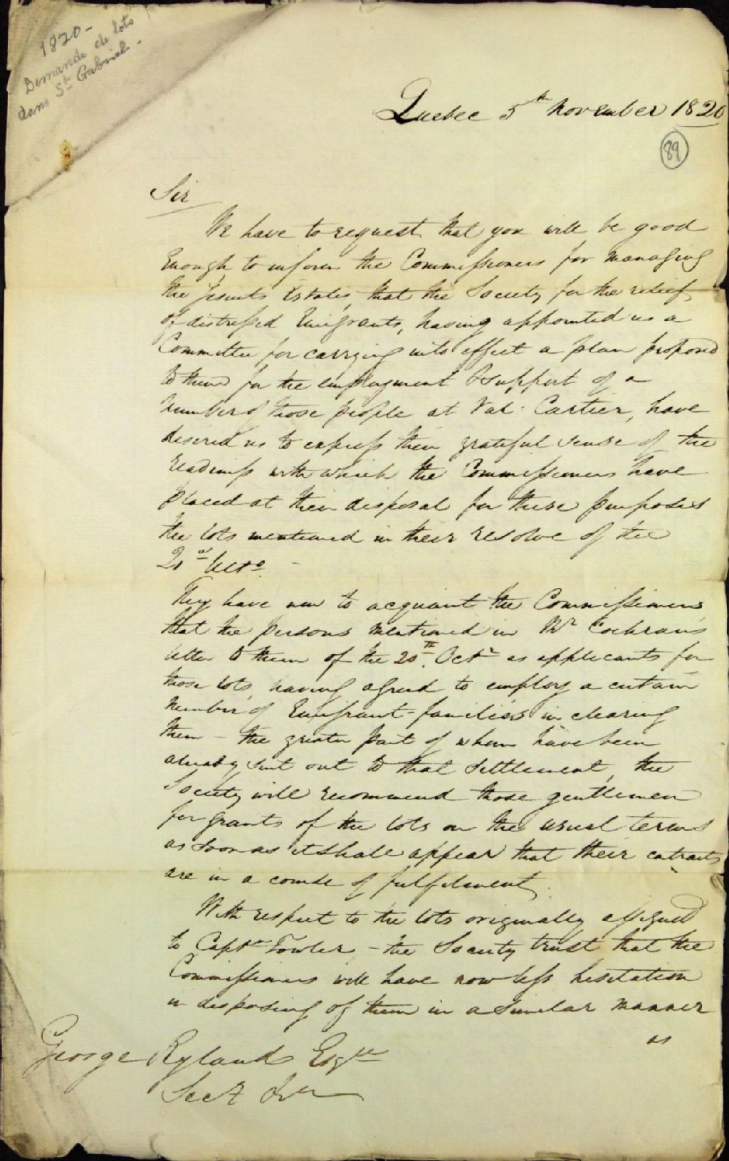 Lettre d'E. Bower, Joseph Langley et Andrew William Cochran (Cochrane), membres de la Société pour le soulagement des immigrants en détresse (Société de Québec des émigrés, DBC), à George Ryland, secrétaire de la Commission des biens des Jésuites, à propos du travail fait par des membres de la société pour défricher certains lots de la seigneurie Saint-Gabriel près de Valcartier, 5 novembre 1820, Archives nationales à Québec, Fonds Ministère des Terres et Forêts, (03Q,E21,S64,SS5,SSS6,D89).