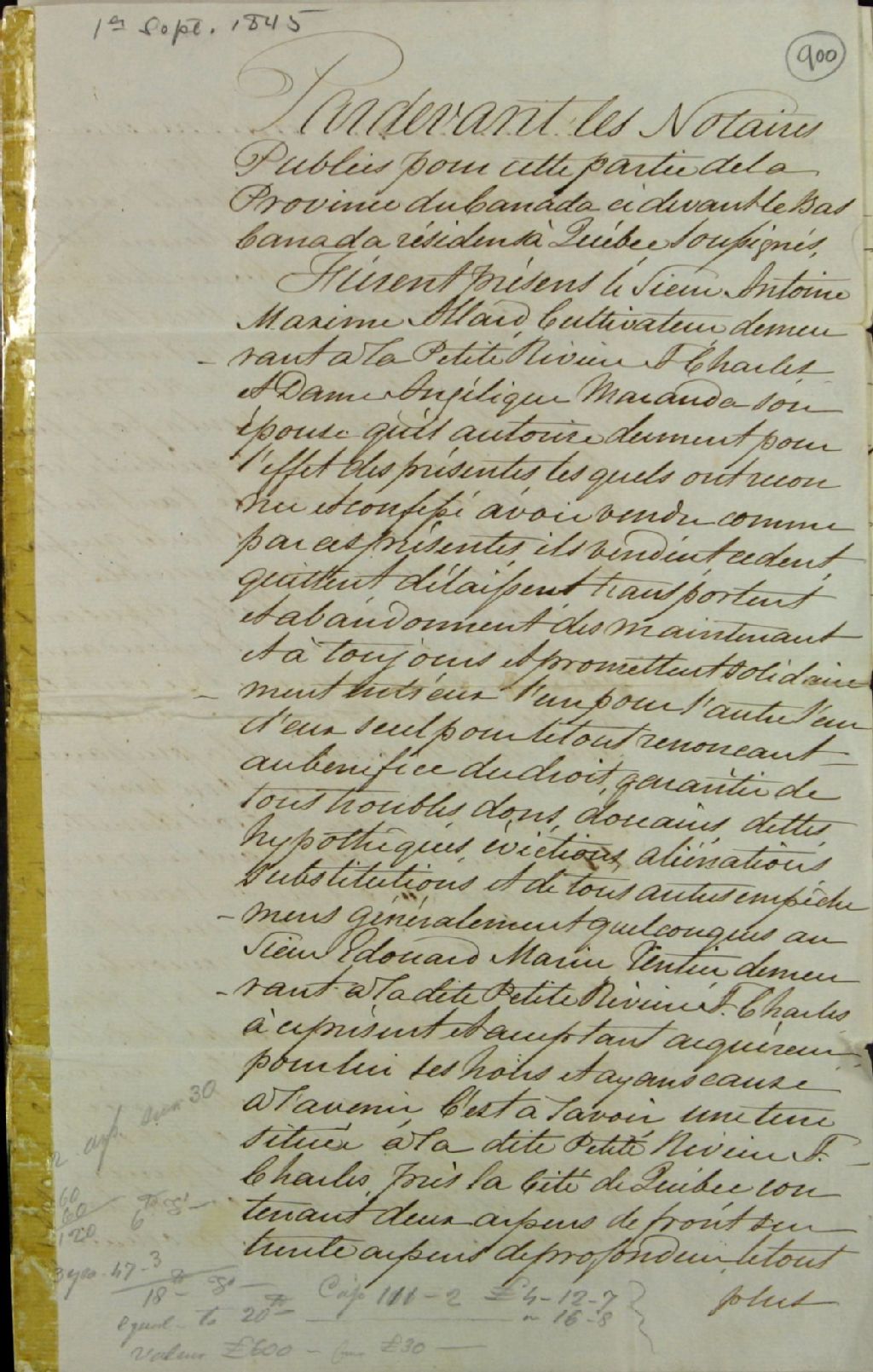 - Acte de vente d'une terre située à la Petite-Rivière-Saint-Charles près de Québec, seigneurie Saint-Gabriel, par Antoine-Maxime Allard, cultivateur de la Petite-Rivière-Saint-Charles, et son épouse Angélique Maranda, à Édouard Marier, rentier du même endroit, par-devant Sirois, notaire public