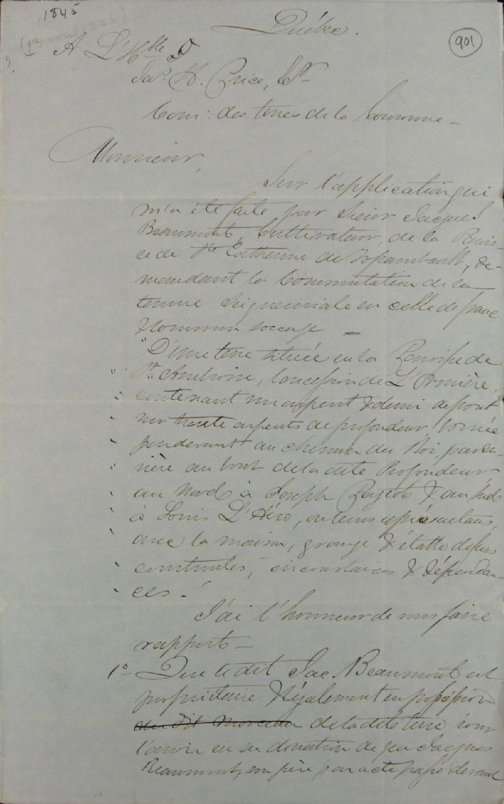 - Brouillon d'un rapport à l'attention de James Hervey Price, commissaire des terres de la Couronne, relatif à la demande de commutation de la tenure seigneuriale en franc et commun socage de Jacques Beaumont, de Sainte-Catherine de Fossambault