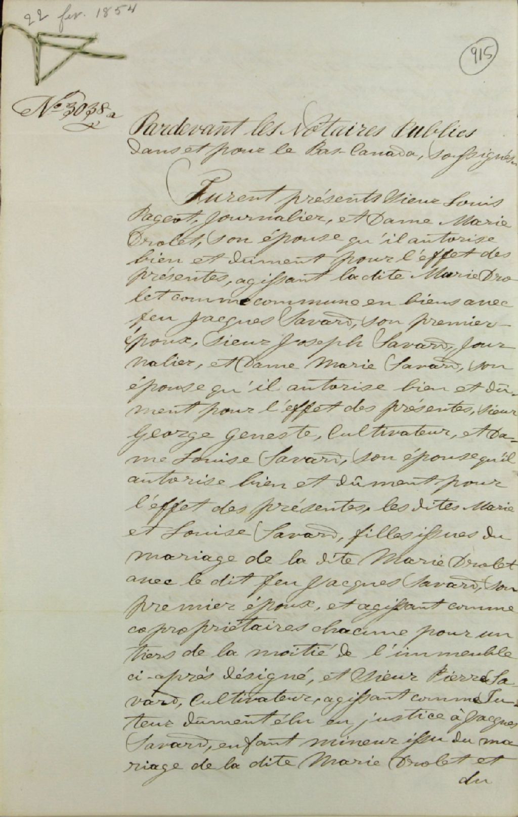 Licitation (vente aux enchères d'un immeuble dans l'indivision) d'un immeuble et ses dépendances situé à la côte de l'Ormière, paroisse Saint-Ambroise, seigneurie Saint-Gabriel, propriété de la succession de Jacques Savard [père], à la requête de Louis Pageot (Pajot, Pageau), journalier, et son épouse Marie Drolet (Drolette), laquelle agissant comme commune en bien avec son premier époux, Jacques Savard [père], avec Joseph Savard, journalier, et son épouse Marie Savard, George Geneste (Genest), cultivateur, et son épouse Louise Savard, lesdites Marie et Louise Savard étant les filles majeures issues du mariage de Marie Drolet et Jacques Savard [père], et Pierre Savard, cultivateur, agissant comme tuteur de Jacques Savard [fils], enfant mineur du même mariage; vente faite à Richard Freeman, écuyer et marchand demeurant à Saint-Ambroise de la Jeune-Lorette
