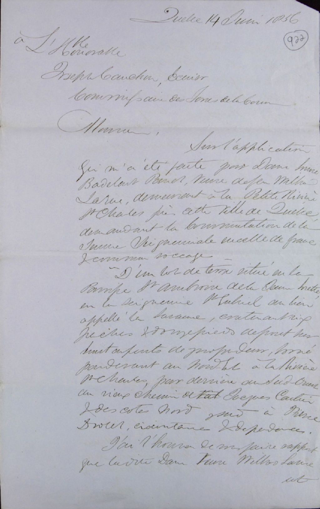 Rapport à l'attention de Joseph [Édouard] Cauchon, écuyer, commissaire des terres de la Couronne, à la suite de la requête présentée par Louise Badelard Panet, veuve de William Larue, demeurant à la Petite-Rivière-Saint-Charles près de Québec, dans le but d'obtenir la commutation de la tenure seigneuriale en celle de franc et commun socage d'une terre située à la Savanne de la paroisse Saint-Ambroise de la Jeune-Lorette, seigneurie Saint-Gabriel, 14 juin 1856, Archives nationales à Québec, Fonds Ministère des Terres et Forêts, (03Q,E21,S64,SS5,SSS6,D922).