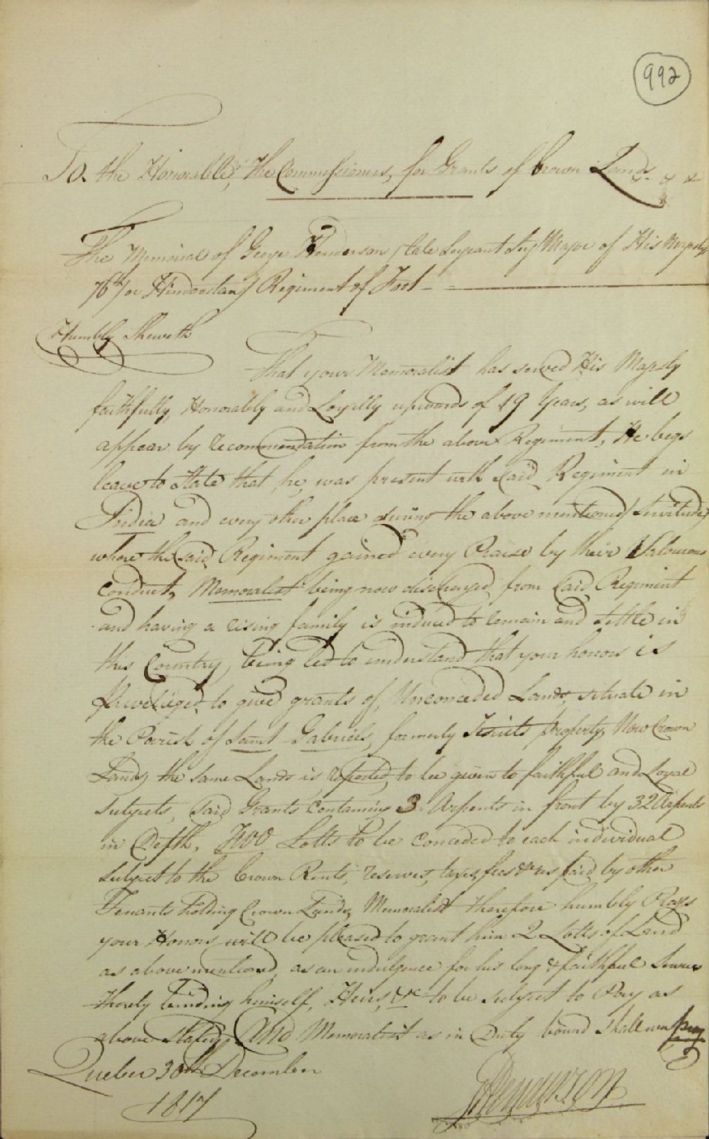 Requête de George Henderson (Anderson), anciennement sergent major du soixante-seizième régiment hindou d'infanterie de Sa Majesté (His Majesty's seventy-sixth Hindoostan Regiment of Foot), adressée à la commission responsable de concéder les terres de la Couronne [commission responsable de l'administration des biens des Jésuites], afin de se faire concéder deux terres dans la seigneurie Saint-Gabriel, 20 décembre 1817, Archives nationales à Québec, Fonds Ministère des Terres et Forêts, (03Q,E21,S64,SS5,SSS6,D992).