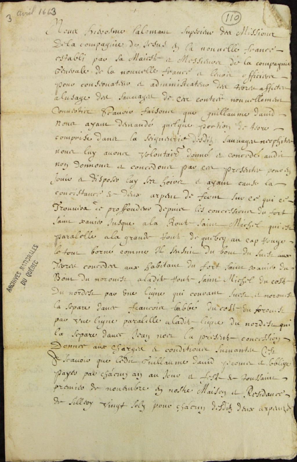 Concession accordée par les Jésuites à Guillaume David. Signé H. Lalemant. 3 p., 3 avril 1663, Archives nationales à Québec, Fonds Ministère des Terres et Forêts, (03Q,E21,S64,SS5,SSS7,D110).
