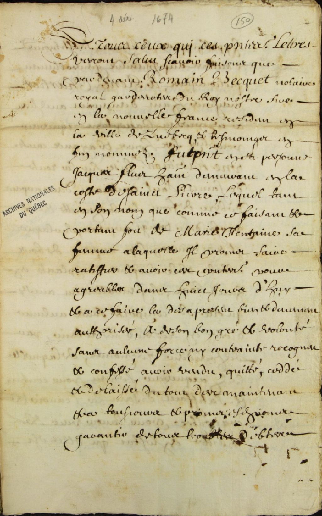 - Acte de vente d'une habitation sise sur la route Saint-Paul dans la seigneurie de Sillery, par Jacques Fluet et son épouse Marie Fontaine, demeurant à la côte Saint-Pierre, à René Chartier, meunier, par-devant Romain Becquet, notaire garde-notes du roi