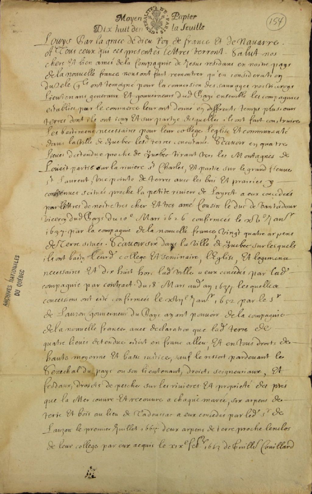 Document intitulé « Amortissement en faveur des Jésuites » par lequel le roi de France exempte les Jésuites de la Nouvelle-France de tout droit et devoir, sauf celui de faire fructifier les terres, pour toutes les terres et concessions déclarées dans le document, c'est-à-dire à Québec, Trois-Rivières et Montréal
