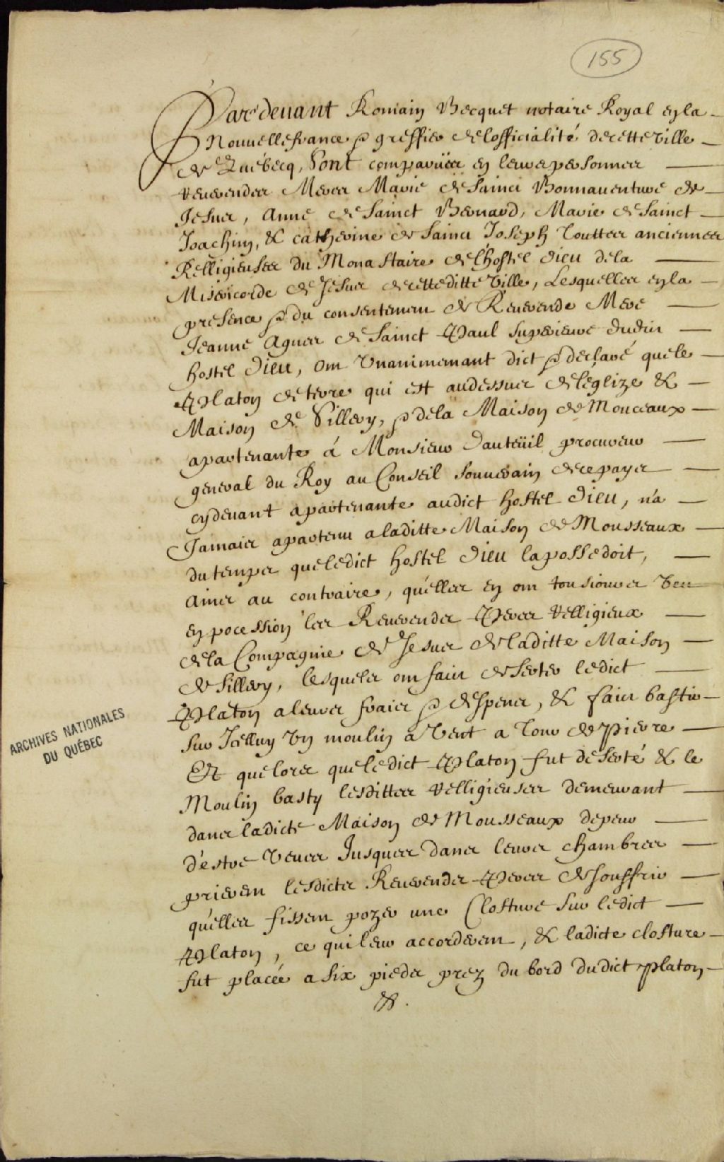 - Déclaration des Dames de l'Hôtel-Dieu en faveur des Religieux de la Compagnie de Jésus (Jésuites), selon laquelle la maison de Monsseaux (Monceaux) du sieur D'Auteuil, située sur le Platon au-dessus de l'église et de leur maison à Sillery, appartient aux Religieux de la Compagnie de Jésus (Jésuites), par-devant Romain Becquet, notaire royal et greffier