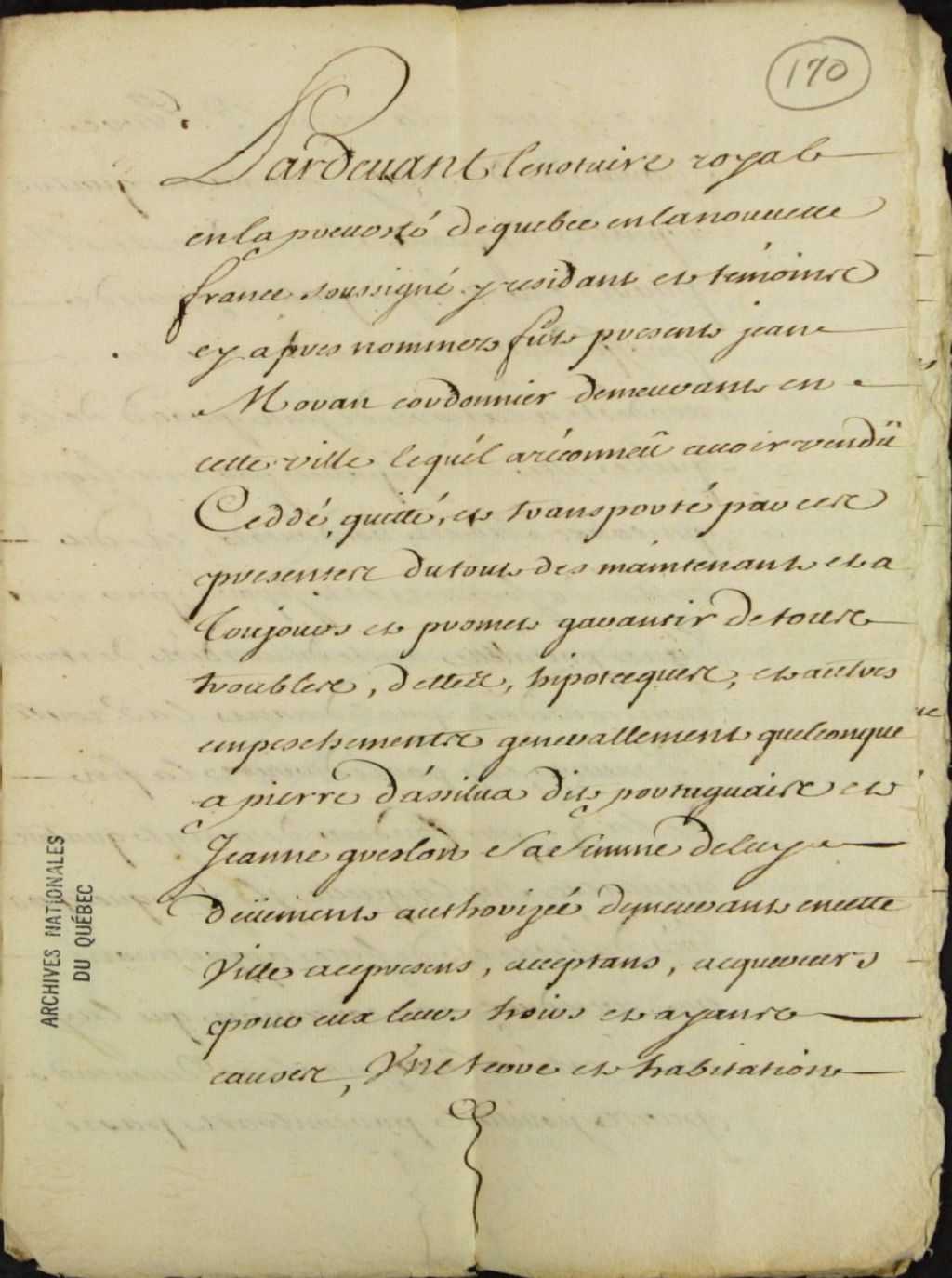 - Acte de vente d'une terre et habitation située à la route Saint-Pierre dans la seigneurie de Sillery, par Jean Moran (Morand), cordonnier à Québec, à Pierre D'Assiva (Dasylva) dit le Portugais et son épouse Jeanne Greslon, par-devant Jean-Étienne Dubreuil, notaire royal