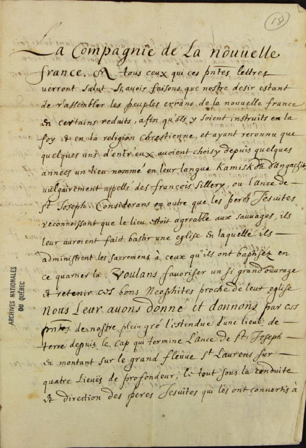 - Copie de la concession accordée par la Compagnie de la Nouvelle-France aux Sauvages (Amérindiens, Hurons) d'une terre à l'anse de Saint-Joseph ou Sillery, qui sera sous l'administration des Jésuites, comprenant un droit de pêche dans le Saint-Laurent, signé (Antoine) Cheffault, secrétaire de la Compagnie