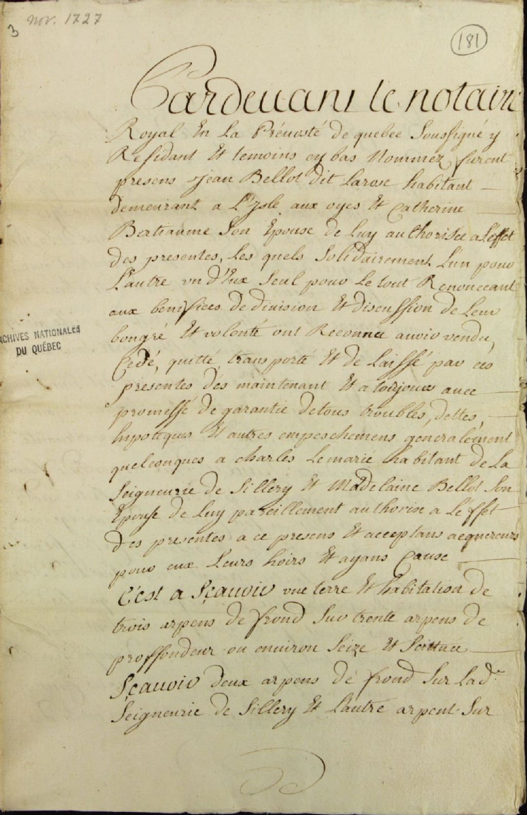 Acte de vente d'une habitation située en partie dans la seigneurie de Sillery, en partie dans celle de Gaudarville, par Jean Bellot (Belleau) dit Larose, habitant de l'Isle aux Oyes (Île aux Oies), et son épouse Catherine Bertiaume (Berthiaume), à Charles Lemarié, habitant de la seigneurie de Sillery, et son épouse Madeleine Bellot (Belleau), par-devant Pinguet, notaire royal