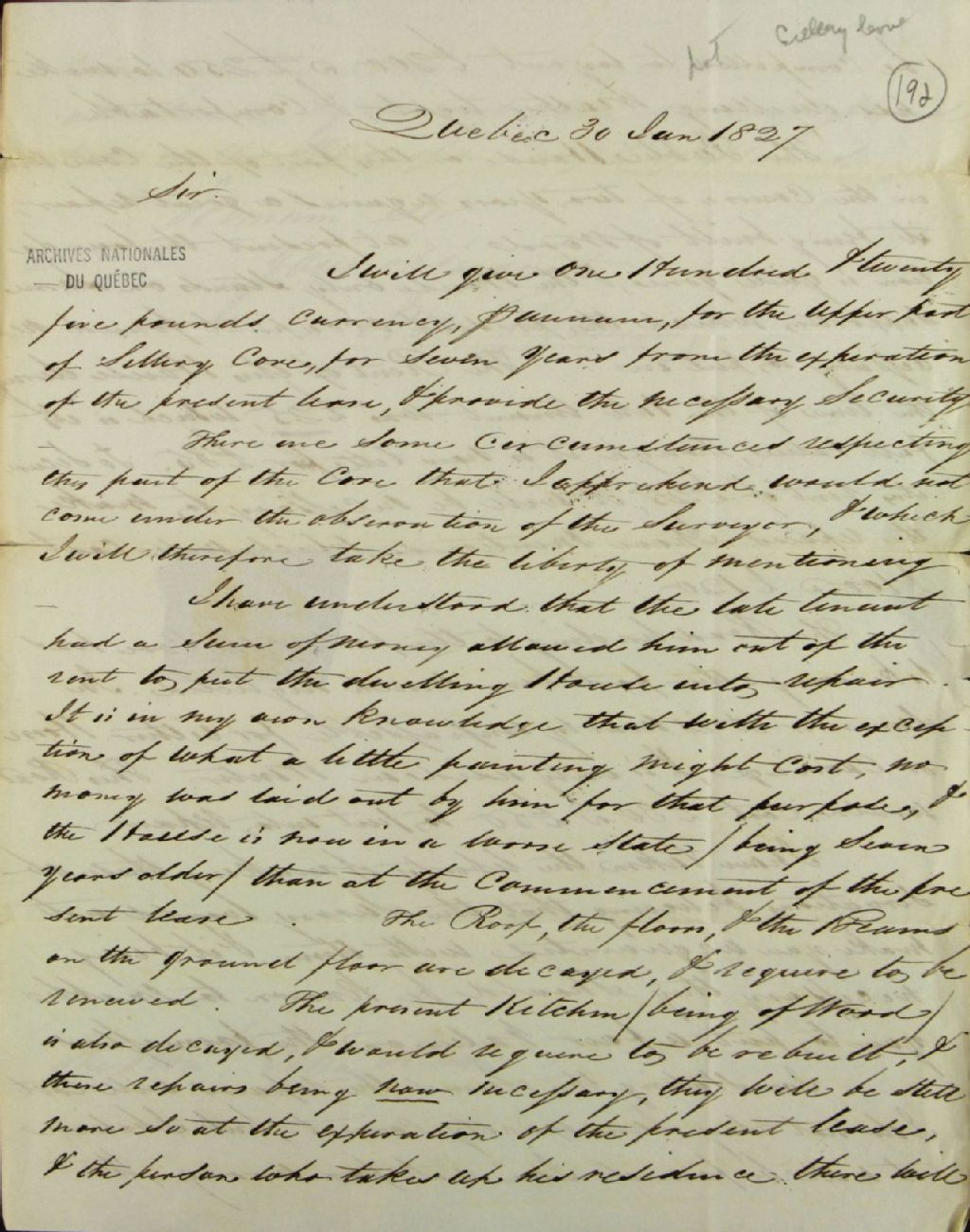 Lettre de [John] Bonner à John Stewart, offrant de louer la partie haute de l'anse de Sillery [lot de grève], 30 janvier 1827, Archives nationales à Québec, Fonds Ministère des Terres et Forêts, (03Q,E21,S64,SS5,SSS7,D192).