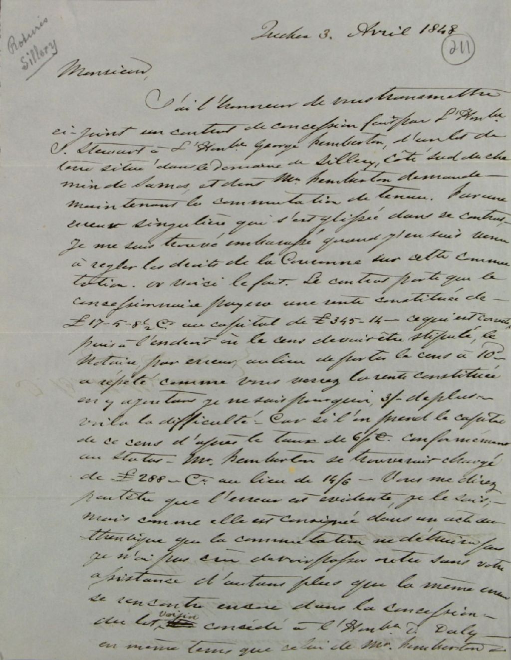 Copie non signée d'une lettre adressée à T. Bouthillier, écuyer, lui envoyant en pièce jointe (manquante) un contrat de concession fait par John Stewart à George Pembleton, d'un lot de terre situé dans le domaine de Sillery, côté sud du chemin de Samos, et dont Pembleton demande la commutation de tenure, 3 avril 1848, Archives nationales à Québec, Fonds Ministère des Terres et Forêts, (03Q,E21,S64,SS5,SSS7,D211).