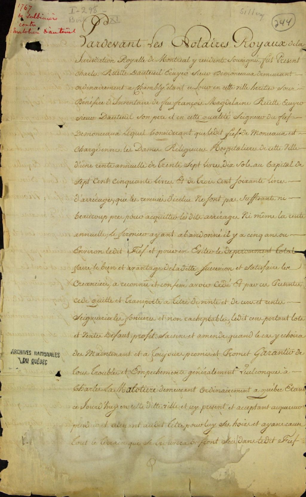 - Les pièces de la liasse comprennent une copie collationnée de l'acte de vente d'une terre du fief Monceaux par Charles Ruette d'Auteuil, héritier de François-Madeleine Ruette sieur d'Auteuil son père, à Charles LaMalotière, le 16 juillet 1749; l'acte de constitution de rente annuelle perpétuelle par Charles LaMalotière d'Auteuil en faveur de Michel Chartier de Lotbinière, le 28 décembre 1749; plusieurs documents (dont un parchemin) relatifs à la vente par encan public du domaine de LaMolatière d'Auteuil à Basset (Bassett), officier du dixième régiment d'infanterie, et d'autres, le4 ou 5 décembre 1767; plusieurs comptes et reçus; jugements mettant en cause Lotbinière et LaMalotière à la Cour du banc du roi, le 9 novembre 1768, et à la Cour des plaidoyers communs, le 8 février 1768
