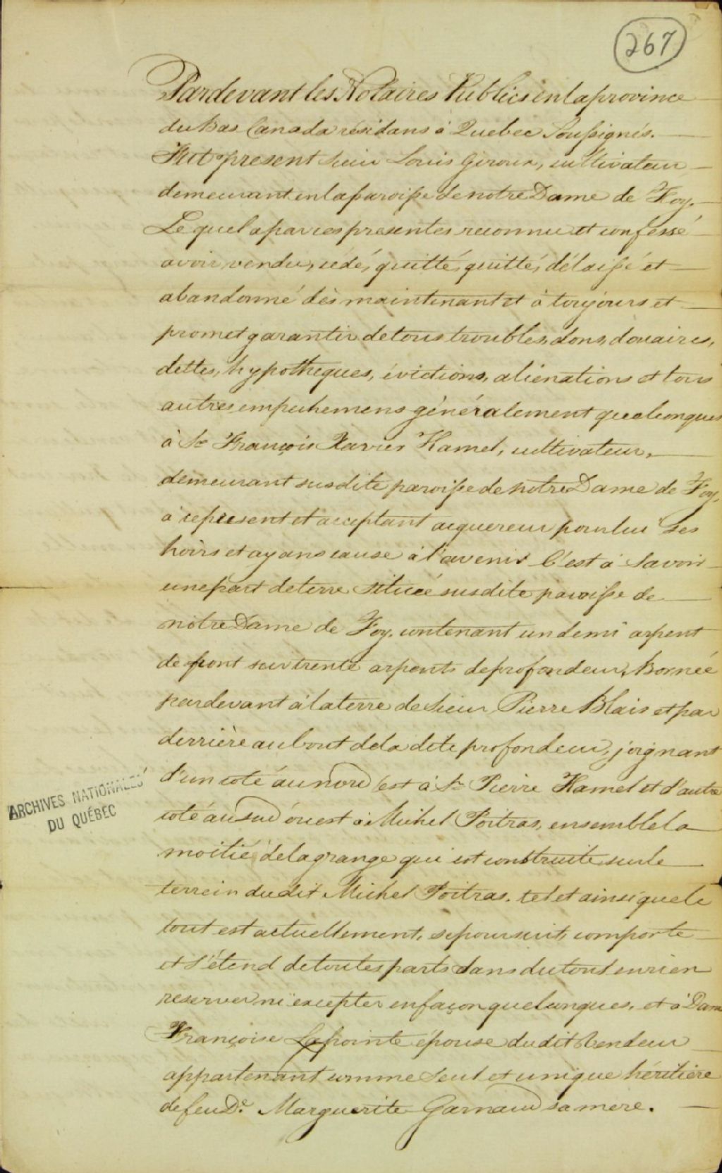 Acte de vente d'une terre située à la paroisse Notre-Dame-de-Foy, par Louis Giroux, cultivateur de la paroisse Notre-Dame-de-Foy (Sainte-Foy), à François-Xavier Hamel, cultivateur du même endroit, par-devant Roger Lelièvre, notaire public, 17 mars 1817, Archives nationales à Québec, Fonds Ministère des Terres et Forêts, (03Q,E21,S64,SS5,SSS7,D267).