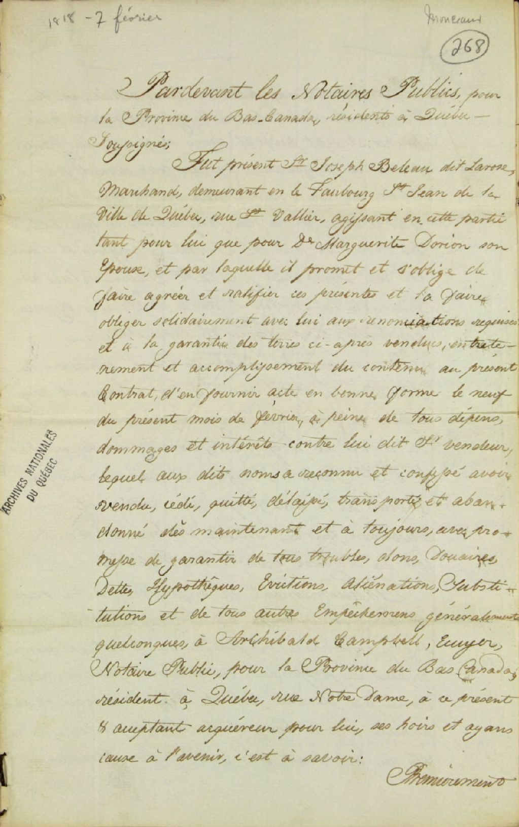 - Acte de vente de trois situées à la paroisse Notre-Dame-de-Foy (Sainte-Foy) par Joseph Beleau (Belleau) dit Larose, marchand demeurant au faubourg Saint-Jean de Québec, rue Saint-Vallier, et son épouse Marguerite Dorion, à Archibald Campbell, écuyer et notaire public du Bas-Canada résidant à Québec rue Notre-Dame, par-devant C. Huot, notaire public