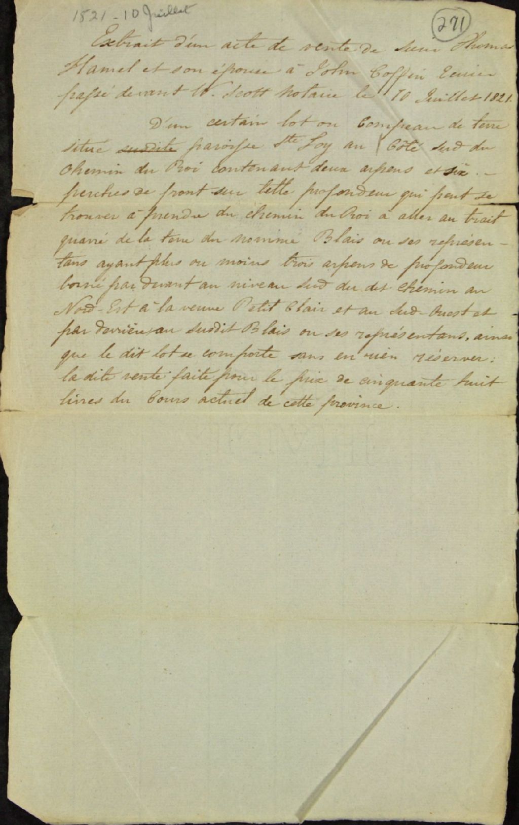 Extrait d'un acte de vente d'une terre située du côté sud du chemin du roi dans la paroisse de Sainte-Foy, par Thomas Hamel et son épouse à John Coffin, écuyer, par-devant Scott, notaire, 10 juillet 1821, Archives nationales à Québec, Fonds Ministère des Terres et Forêts, (03Q,E21,S64,SS5,SSS7,D271).