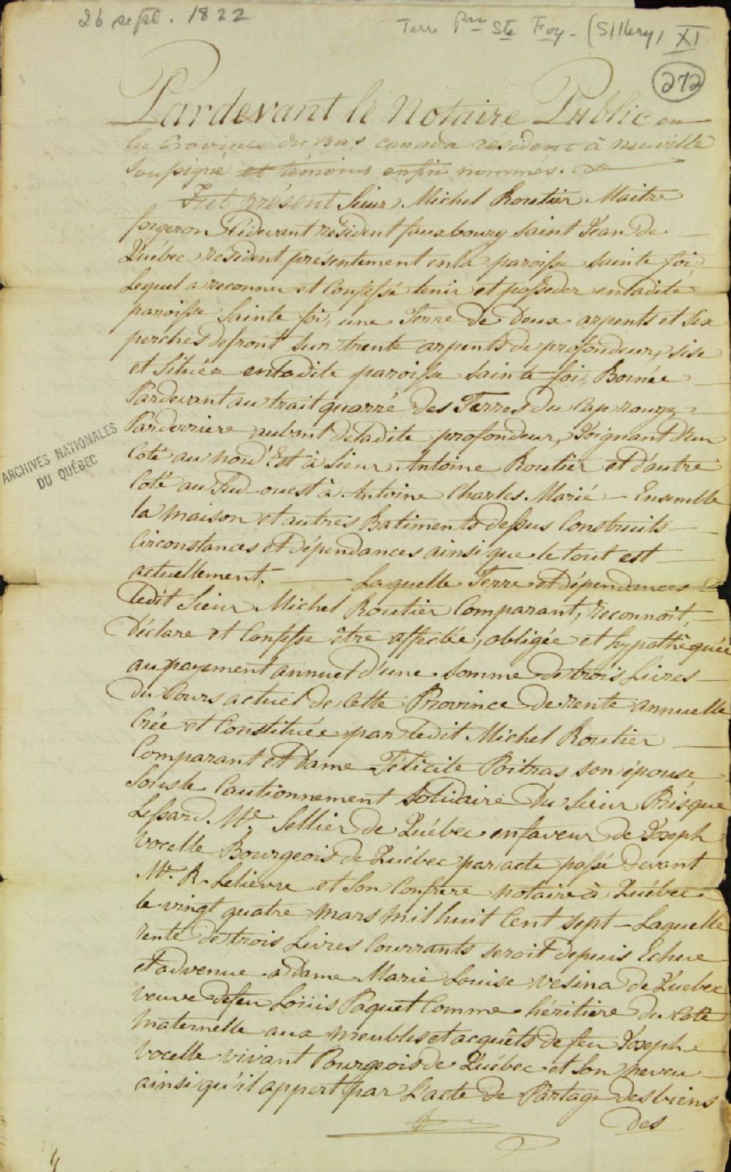 Titre nouvel de rente constituée à prendre sur une terre, maison et autres bâtiments, situés à la paroisse de Sainte-Foy et bornés par le trait-quarré (trait-carré) des terres du Cap-Rouge, par Michel Routier (Routhier), maître forgeron résidant au faubourg Saint-Jean de Québec, et son épouse Félicité Poitras, sous le cautionnement solidaire de Prisque Lessard, maître sellier (fabricant et marchand de selles) de Québec, en faveur de Marie Louise Vésina de Québec, veuve de Louis Paquet, et titulaire de la rente par héritage du côté maternel de Joseph Vocelle, de son vivant bourgeois à Québec, par-devant François-Xavier Larue