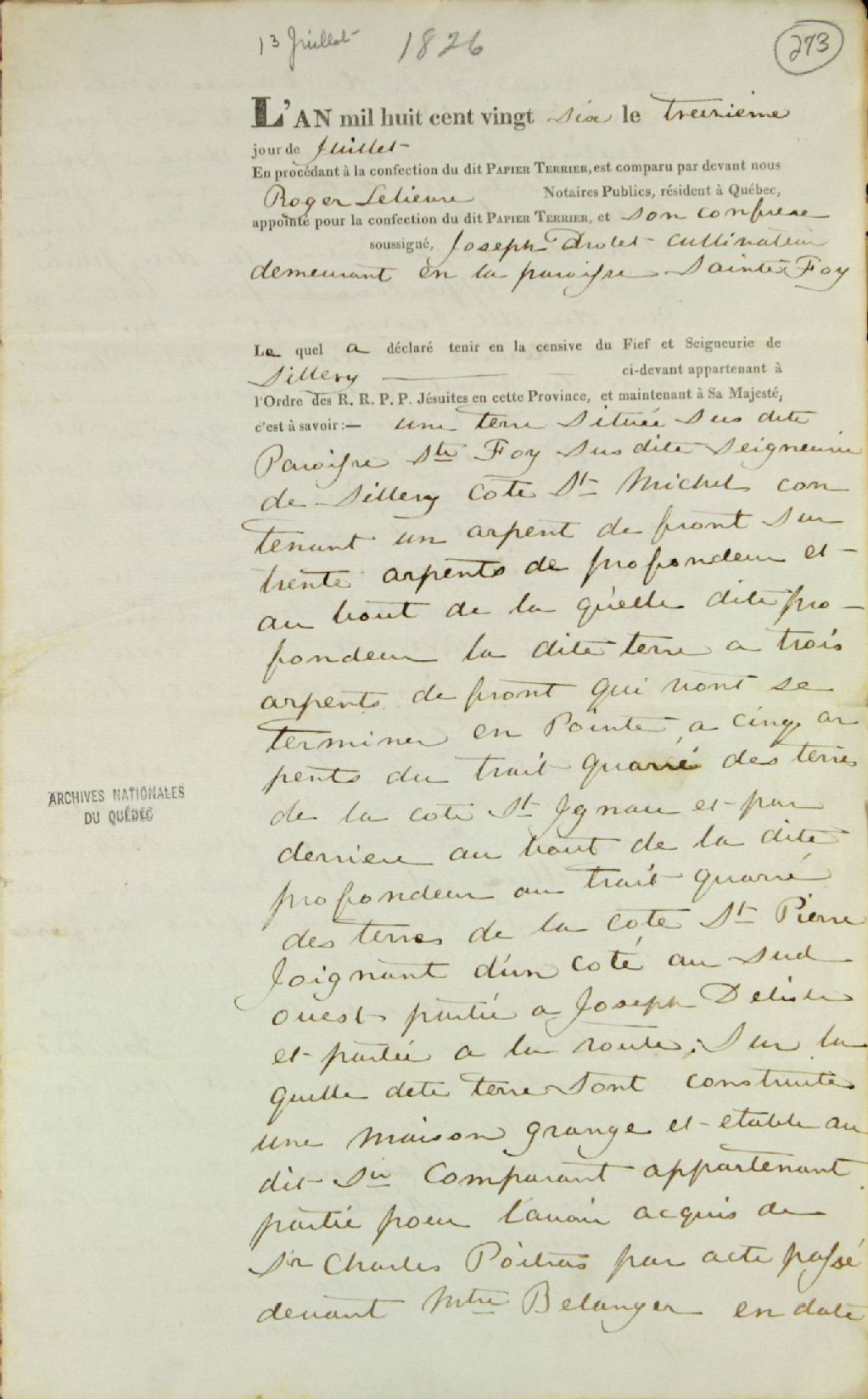 Déclaration de possession de terre (titre nouvel) en vue de confectionner le papier terrier du fief et seigneurie de Sillery de Joseph Drolet (Drolette), cultivateur demeurant à la paroisse de Sainte-Foy, pour une terre située à la cote Saint-Michel dans la paroisse de Sainte-Foy, par-devant Roger Lelièvre et Robert Christie, notaires publics, et reçu de paiement des arrérages de Joseph Drolet (Drolette) suivant sa déclaration au papier terrier, 13 juillet 1826, Archives nationales à Québec, Fonds Ministère des Terres et Forêts, (03Q,E21,S64,SS5,SSS7,D273).