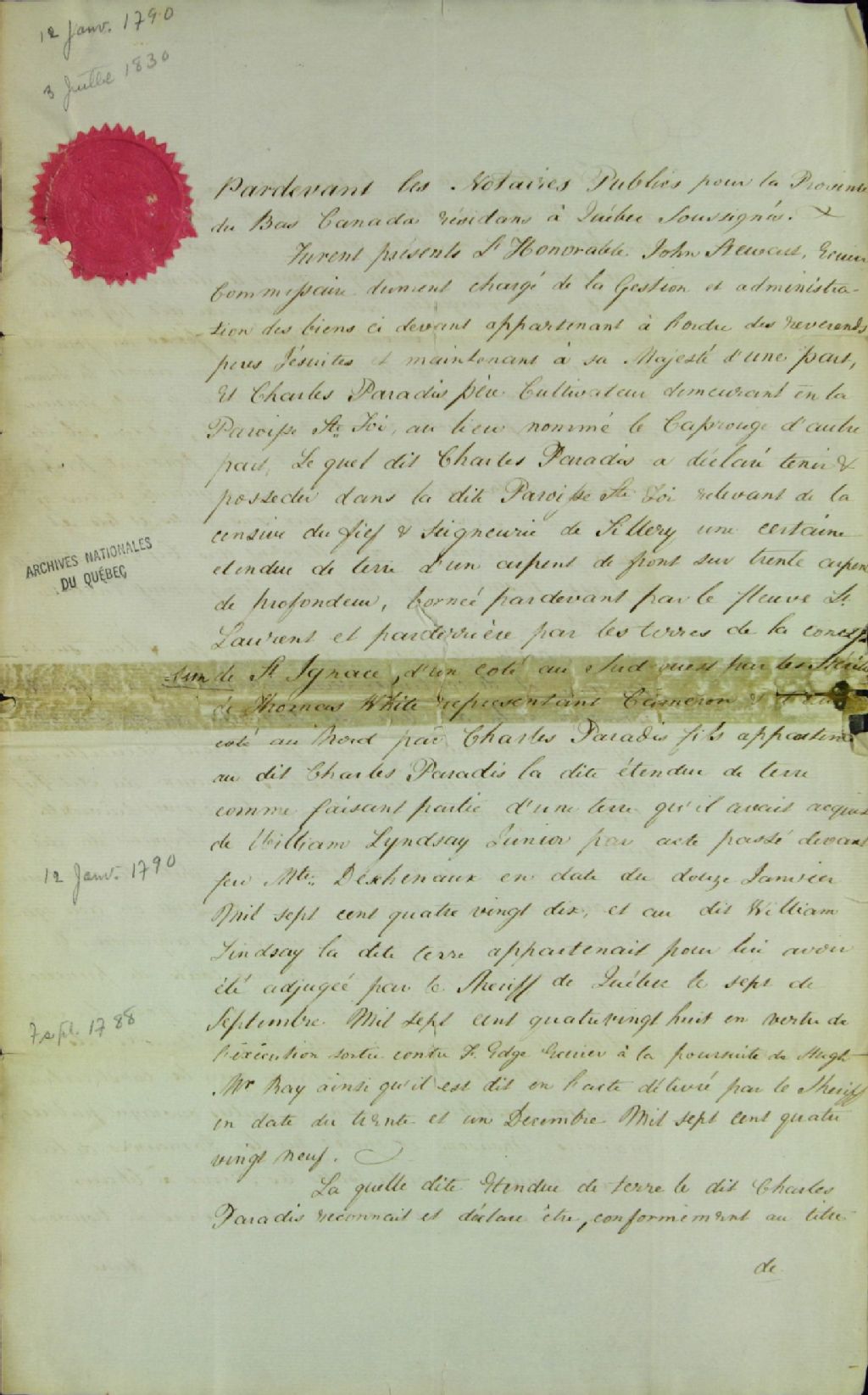 Titre nouvel de Charles Paradis père, culivateur de Sainte-Foy demeurant au Cap-Rouge, pour une terre située à la concession Saint-Ignace dans la seigneurie de Sillery, par John Stewart, écuyer, membre du Conseil exécutif de la province du Bas-Canada et commissaire des biens des Jésuites, par-devant Archibald Campbell, notaire public, 3 juillet 1830, Archives nationales à Québec, Fonds Ministère des Terres et Forêts, (03Q,E21,S64,SS5,SSS7,D283).