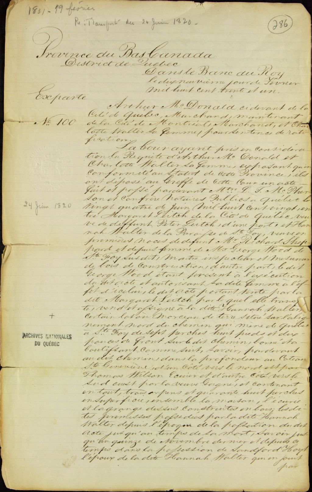 - Copie du jugement de la Cour du Banc du roi permettant la ratification du titre de propriété d'Arthur McDonald, marchand de Québec et maintenant de Montréal, et son épouse Charlotte Walter, pour une terre située sur l'alignement nord du chemin allant de Québec à Sainte-Foy