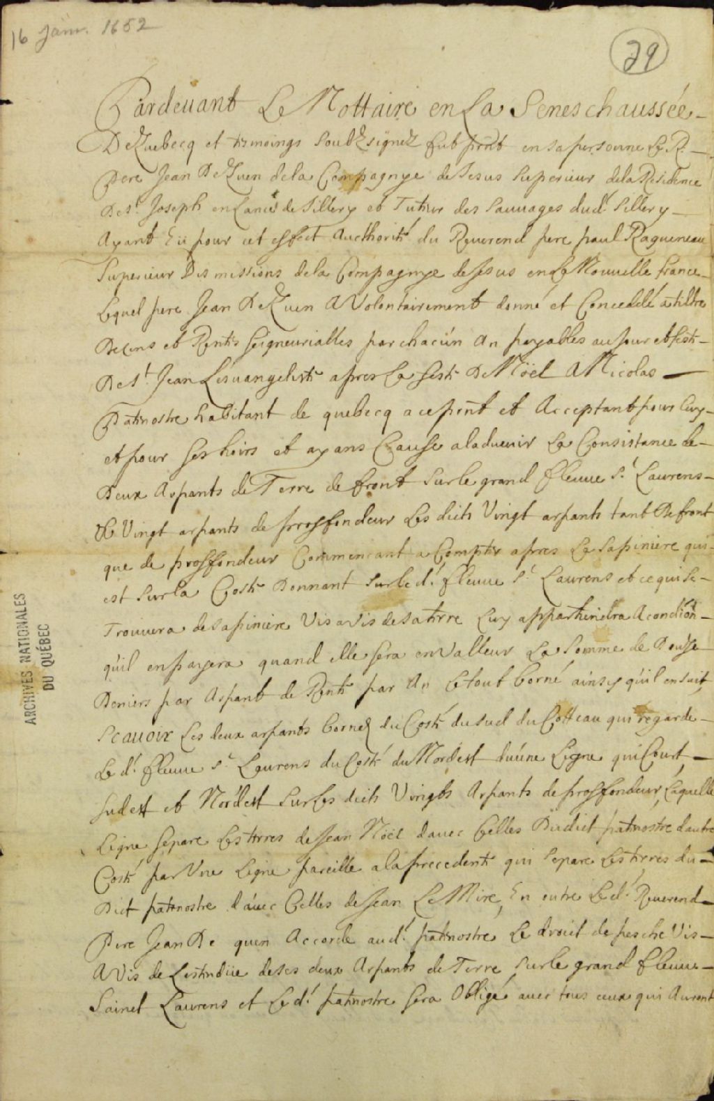 Acte de concession d'une terre située à Québec donnant sur le fleuve Saint-Laurent, par les Révérends Pères Jésuites à Nicolas Patenotre (Patenaude), habitant de Québec, par-devant Rolland Godet, notaire