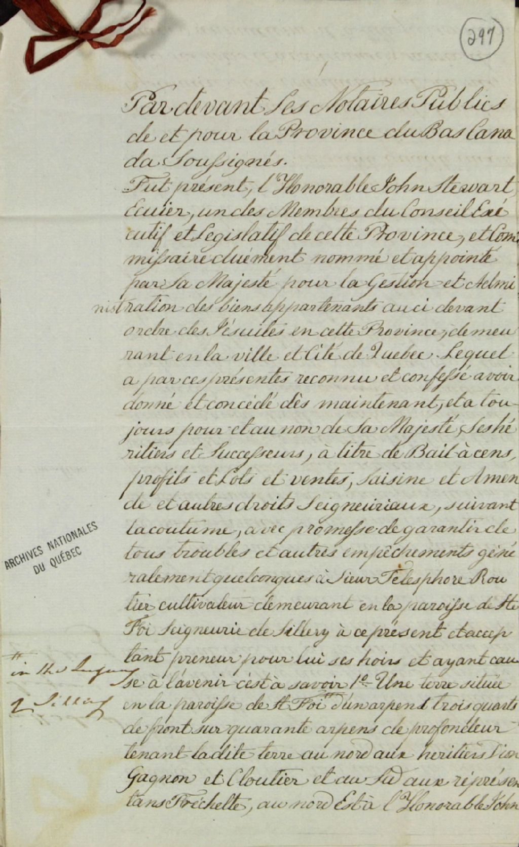 - Acte de concession d'une terre située dans la paroisse de Sainte-Foy, seigneurie de Sillery, par John Stewart, écuyer, membre du Conseil exécutif de la province du Bas-Canada et commissaire des biens des Jésuites, à Télesphore Routier (Routhier), cultivateur de Sainte-Foy
