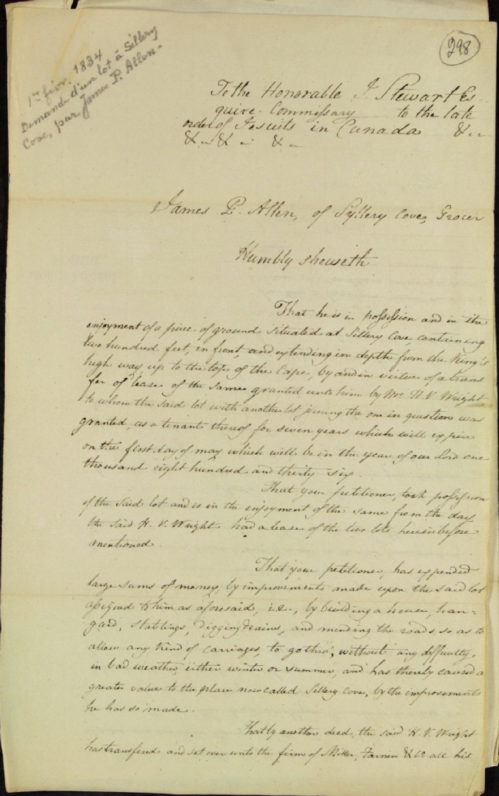 Requête de James P. Allen, épicier de l'anse de Sillery (Sillery Cove), adressée à John Stewart, écuyer et commissaire des biens des Jésuites, afin d'obtenir un renouvellement de bail pour le lot de terre, incluant les droits de grève, qu'il occupe à Sillery, 1er février 1834, Archives nationales à Québec, Fonds Ministère des Terres et Forêts, (03Q,E21,S64,SS5,SSS7,D298).
