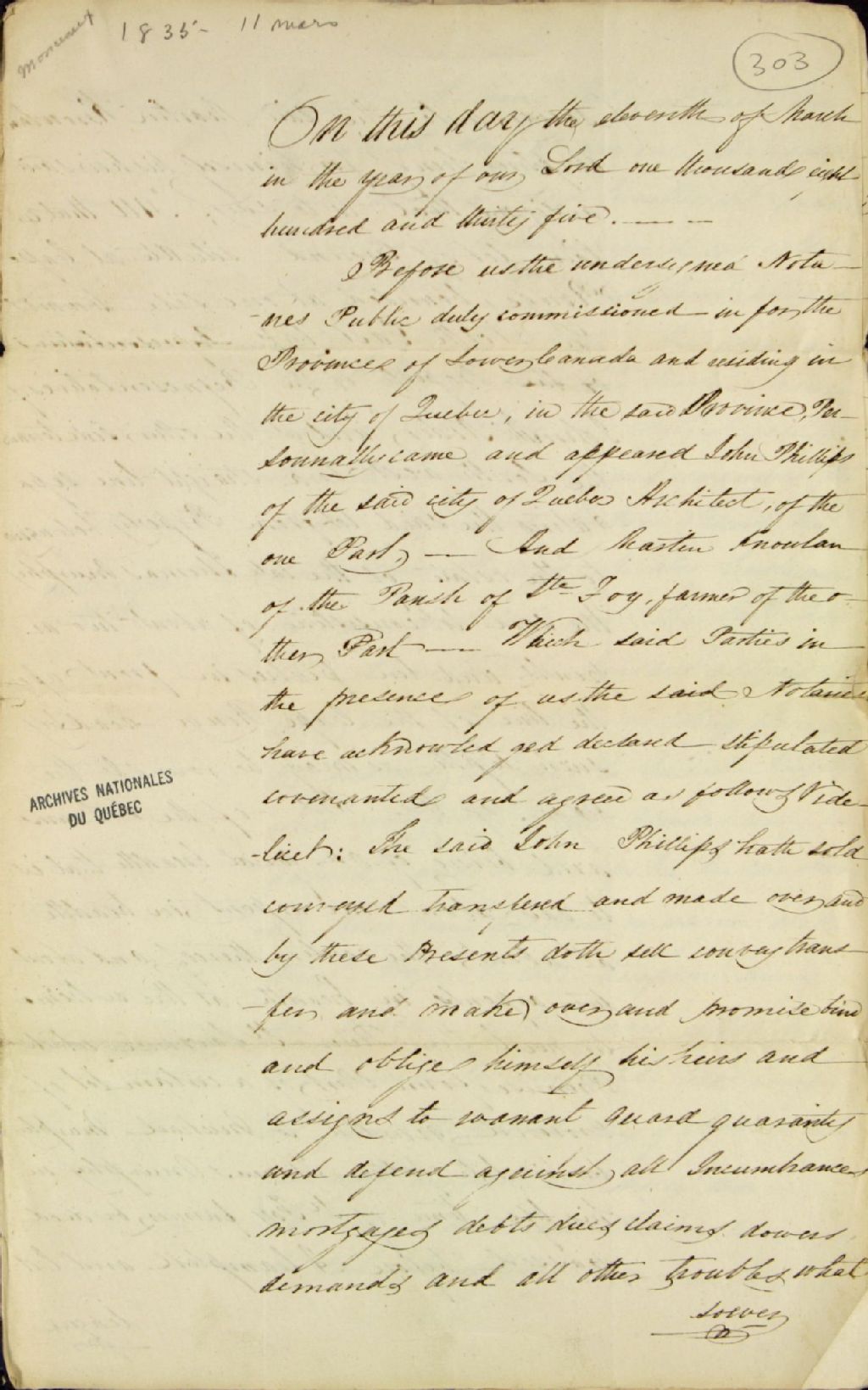 - Acte de vente d'une terre située au Cap-Rouge [dans la seigneurie de Sillery] par John Phillips, architecte de la ville de Québec, à Martin Knowlan (Nowlan), fermier de la paroisse de Sainte-Foy, par-devant Louis Panet, notaire public