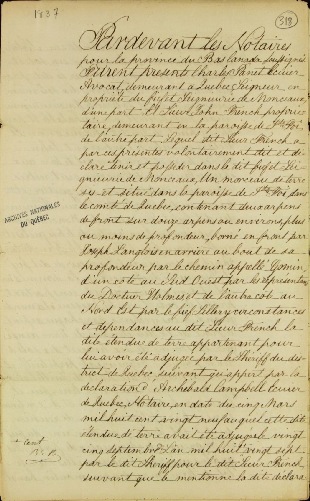 Titre nouvel de John French, propriétaire demeurant à Sainte-Foy, pour une terre située dans la paroisse de Sainte-Foy faisant partie du fief Monceaux, accordé par Charles Panet, écuyer et avocat demeurant à Québec, seigneur du fief et seigneurie de Monceaux, par-devant René-Gabriel Belleau, notaire, 21 mars 1837, Archives nationales à Québec, Fonds Ministère des Terres et Forêts, (03Q,E21,S64,SS5,SSS7,D318).