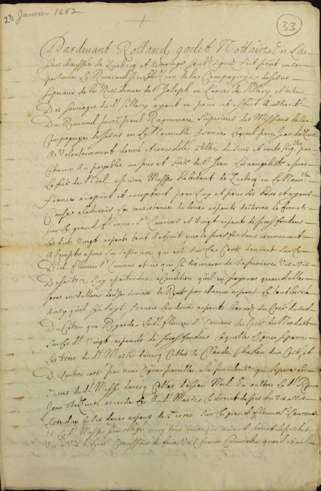Acte de concession d'une terre située à Québec donnant sur le fleuve Saint-Laurent, par les Révérends Pères Jésuites à Pierre Masse, habitant de Québec, par-devant Rolland Godet, notaire