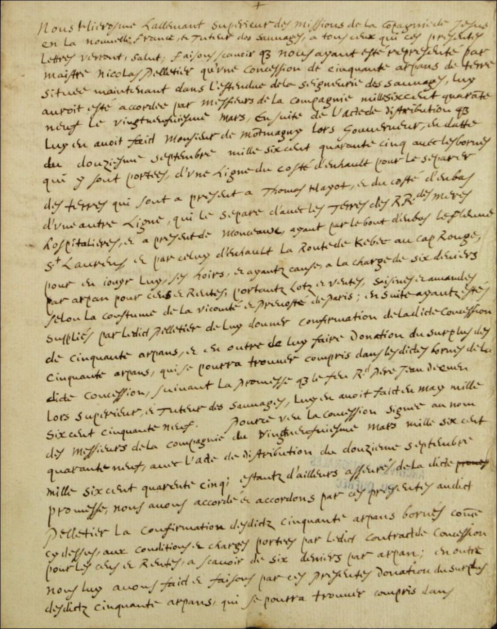 - Confirmation par Hierosme (Jérôme) Lalemant, père jésuite, d'une concession accordée le 29 mars 1649 à Nicolas Pelletier, par-devant Audouart dit Saint-Germain