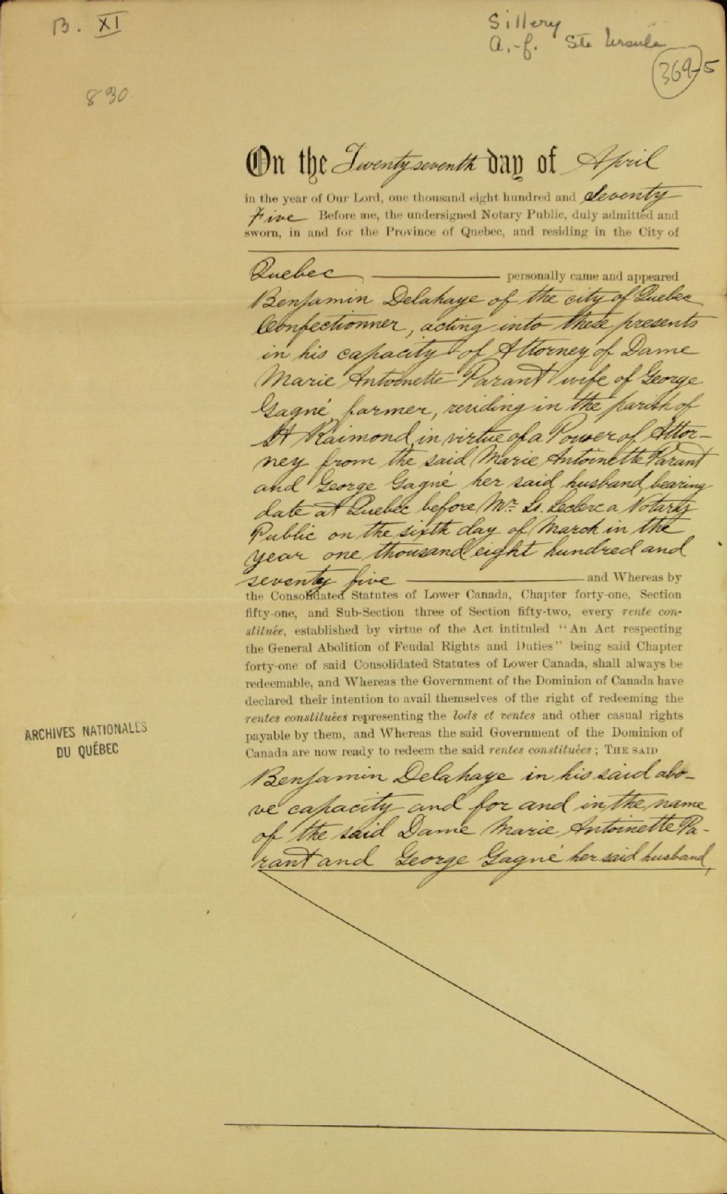 Quittance de Benjamin Delahaye, pâtissier (confectioner) de Québec, en sa qualité de procureur de Marie-Antoinette Parant (Parent), épouse de George Gagné, fermier de la paroisse de Saint-Raymond, en faveur de Sa Majesté, pour une indemnité seigneuriale (rachat de rente constituée) reçue pour sa partie du fief de Sainte-Ursule, par-devant G. Larue, notaire public, 27 avril 1875, Archives nationales à Québec, Fonds Ministère des Terres et Forêts, (03Q,E21,S64,SS5,SSS7,D369-5).