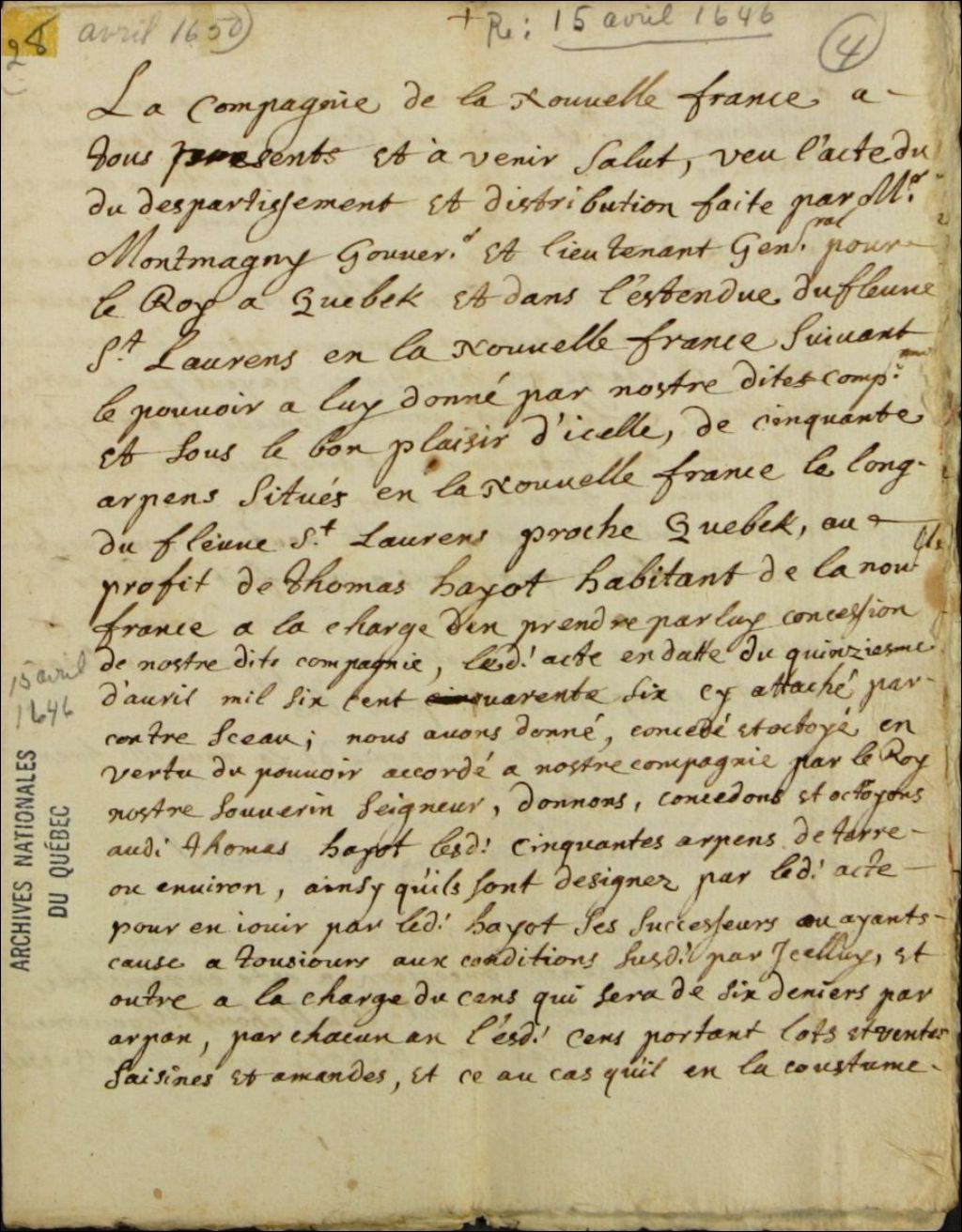 Concession accordée à Thomas Hayot (Haiot) le 15 avril 1646 par le gouverneur Montmagny, avec confirmation par la Compagnie de la Nouvelle-France, en date du 29 mars 1649 d'une terre située dans la banlieue de Québec près de Sillery, accordée par le gouverneur Montmagny aux Hospitalières de Québec, 15 avril 1646 - 29 mars 1649, Archives nationales à Québec, Fonds Ministère des Terres et Forêts, (03Q,E21,S64,SS5,SSS7,D4).