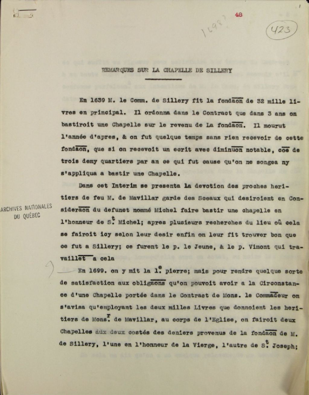 - Copie dactylographiée des remarques sur la construction de la chapelle de Sillery, par les Révérends Pères Jésuites Barthélémy Vimont et Hierosme (Jérôme) Lalemant