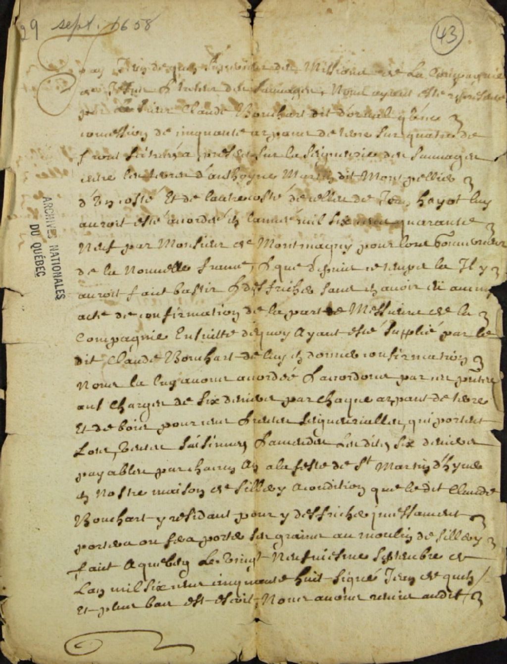 - Confirmation de la concession accordée en 1649 à Claude Bouchard dit Dorval dans la seigneurie des Sauvages (Sillery) par les Révérends Pères Jésuites