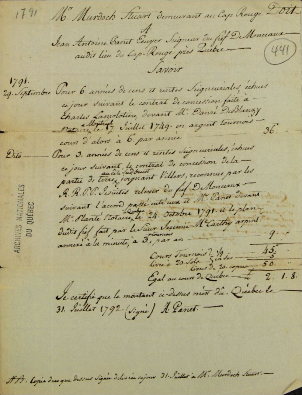 État de compte de Mudoch Stuart demeurant au Cap-Rouge, pour des arrérages de cens et rentes seigneuriales dues à Jean-Antoine Panet, écuyer et seigneurie du fief de Monceaux, 31 juillet 1792, Archives nationales à Québec, Fonds Ministère des Terres et Forêts, (03Q,E21,S64,SS5,SSS7,D441).