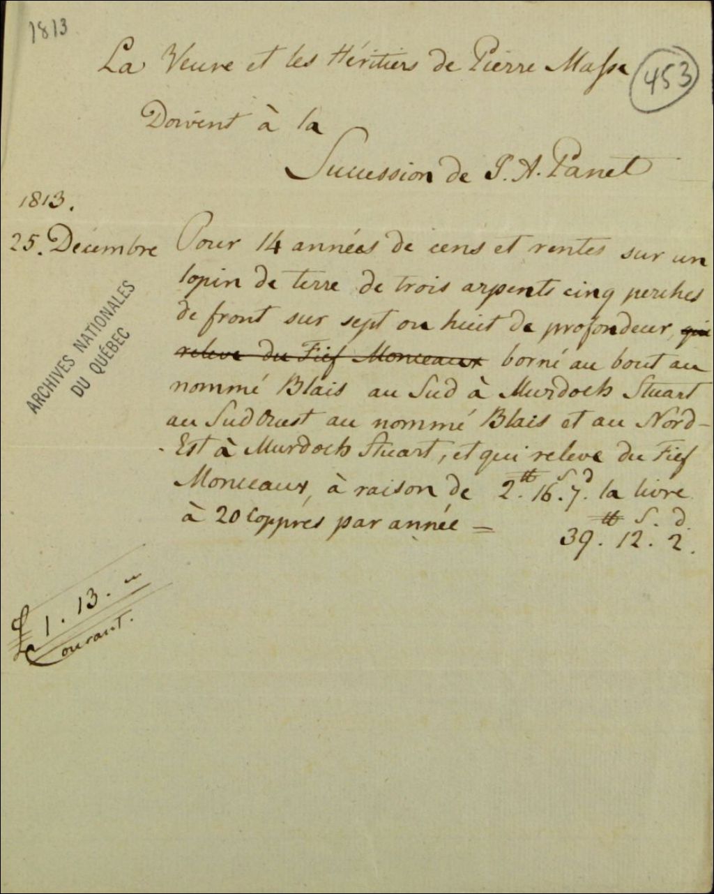État de compte de la veuve et des héritiers de Pierre Masse pour quatorze années de cens et rentes sur une terre qui relève du fief de Monceaux, par la succession de J.-A. Panet, 25 décembre 1813, Archives nationales à Québec, Fonds Ministère des Terres et Forêts, (03Q,E21,S64,SS5,SSS7,D453).