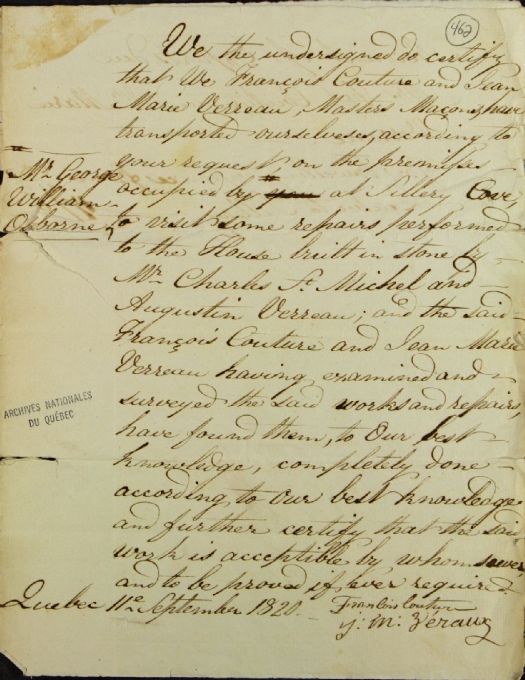 Procès-verbal de François Couture et Jean-Marie Verreau, maîtres maçons, selon lequel ils attestent avoir vérifié les travaux effectués à la maison autrefois occupée par George William Osborne (Usborne) à l'anse de Sillery (Sillery Cove) par Charles Saint-Michel et Augustin Verreau, et compte de dépenses des experts, 11 septembre 1820, Archives nationales à Québec, Fonds Ministère des Terres et Forêts, (03Q,E21,S64,SS5,SSS7,D462).