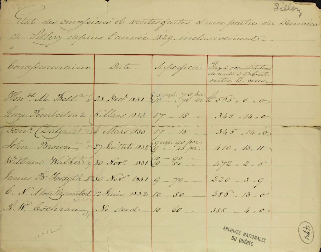 Etat des concessions et ventes faites d'une partie du Domaine de Sillery depuis l'année 1829 inclusivement, comprenant le nom des concessionnaires, la date de la concession, la superficie de la terre et le prix de la constitution de rentes