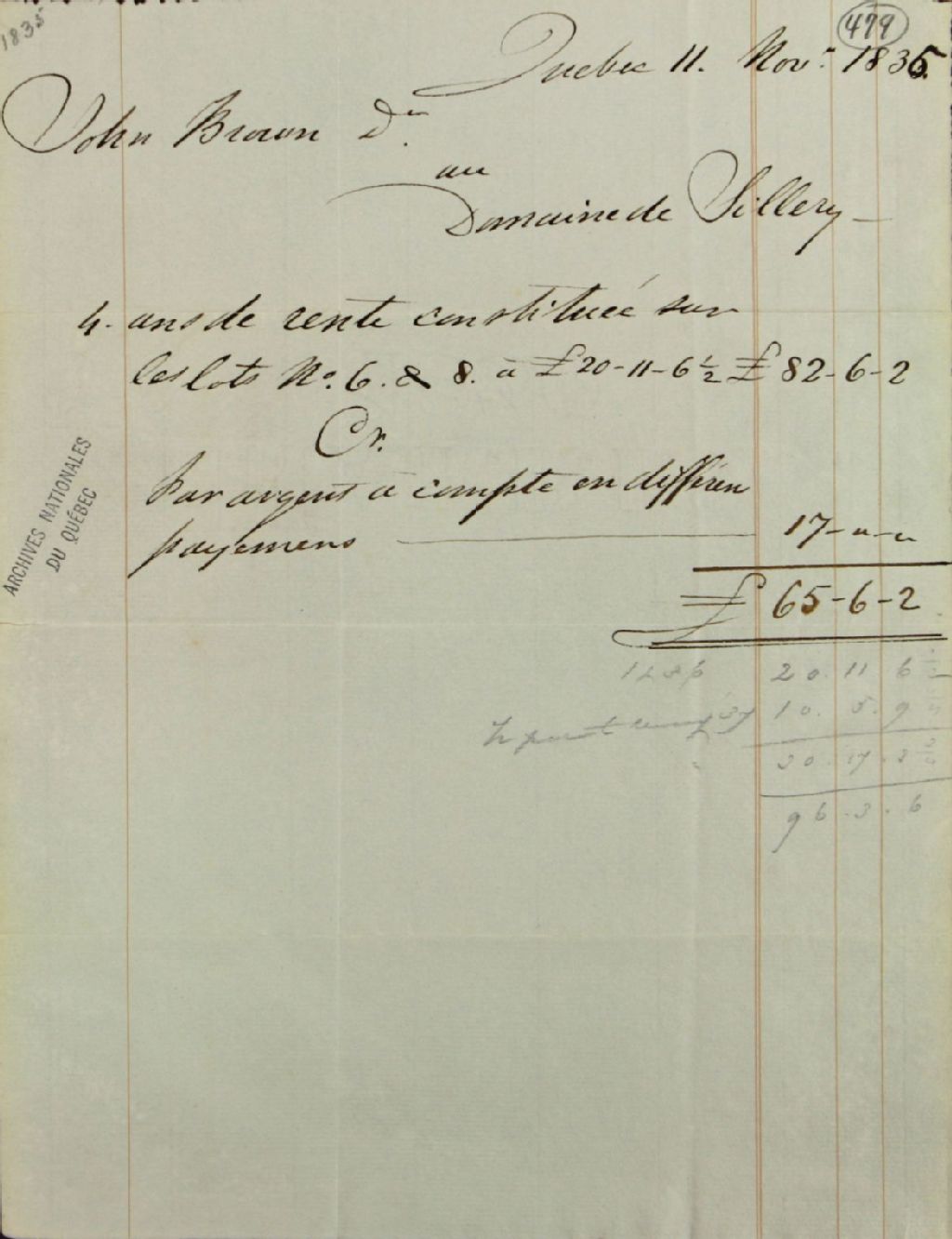 État de compte de John Brown pour quatre ans de rente constituée sur les lots 6 et 8 du domaine de Sillery, 11 novembre 1835, Archives nationales à Québec, Fonds Ministère des Terres et Forêts, (03Q,E21,S64,SS5,SSS7,D479).