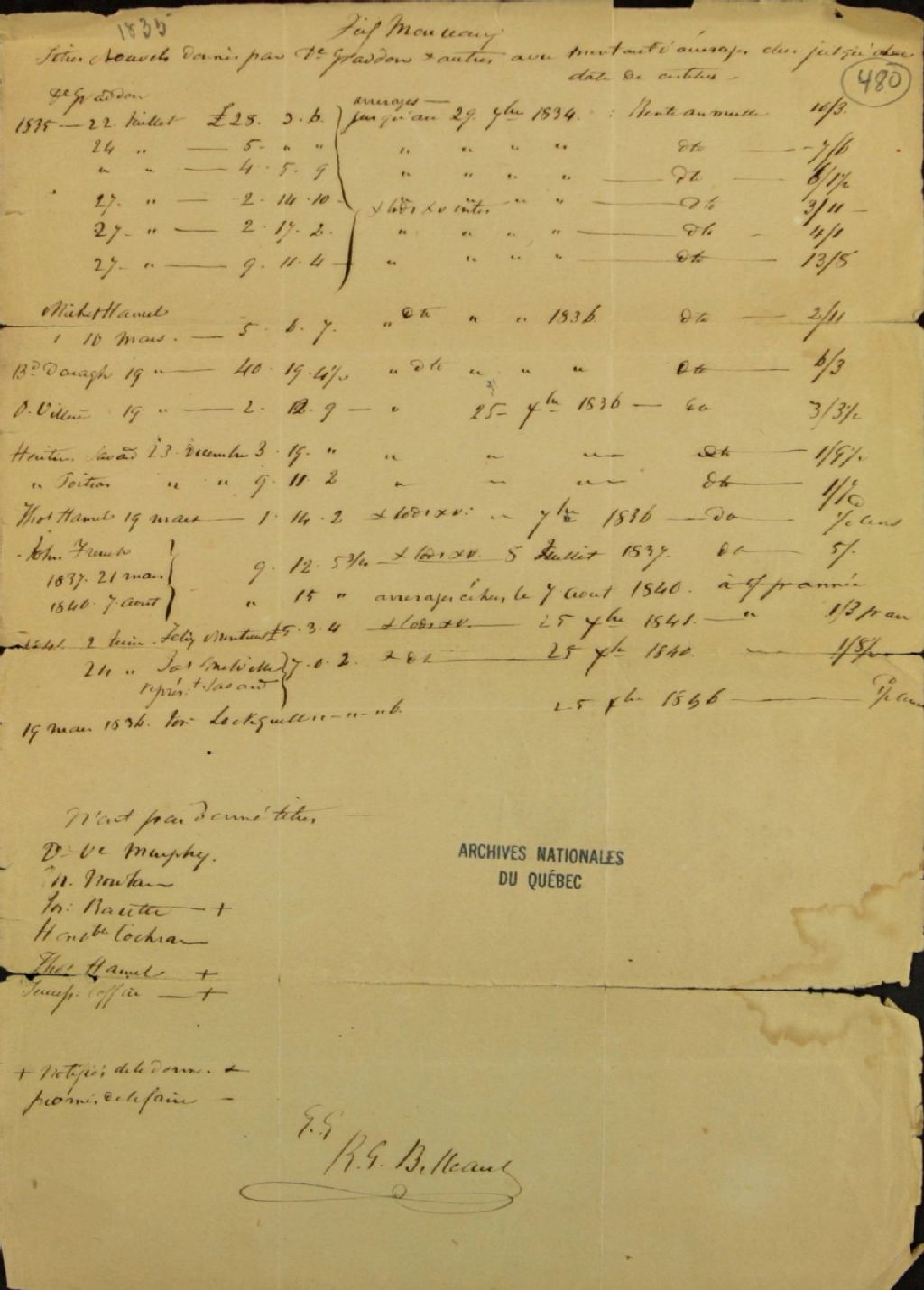 Liste fournie par R. G. Belleau des censitaires du fief de Monceaux qui n'ont pas donné leur titres nouvels, vers 1841, Archives nationales à Québec, Fonds Ministère des Terres et Forêts, (03Q,E21,S64,SS5,SSS7,D480).