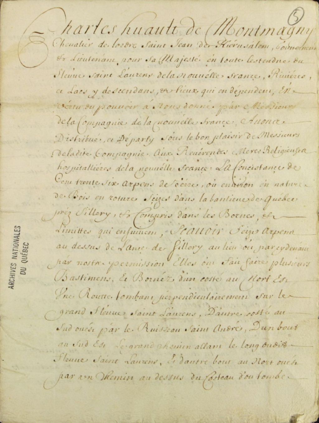 Copie de l'acte de concession d'une terre située dans la banlieue de Québec près de Sillery, aux Hospitalières de Québec par le gouverneur Montmagny et ratification (confirmation) par les directeurs de la Compagnie de la Nouvelle-France de ladite concession, signé Lamy, 1 août 1646 - 29 mars 1649, Archives nationales à Québec, Fonds Ministère des Terres et Forêts, (03Q,E21,S64,SS5,SSS7,D5).