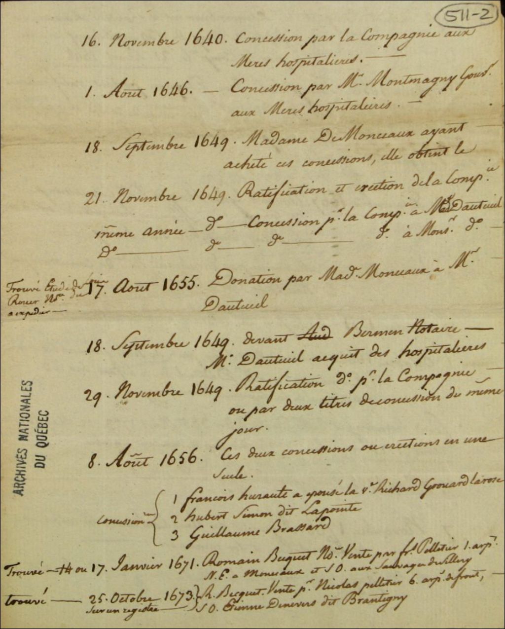 Chaîne de titres (1640 - 1768) concernant le fief de Monceaux et la seigneurie de Sillery, 1626 - 1882, Archives nationales à Québec, Fonds Ministère des Terres et Forêts, (03Q,E21,S64,SS5,SSS7,D511-2).