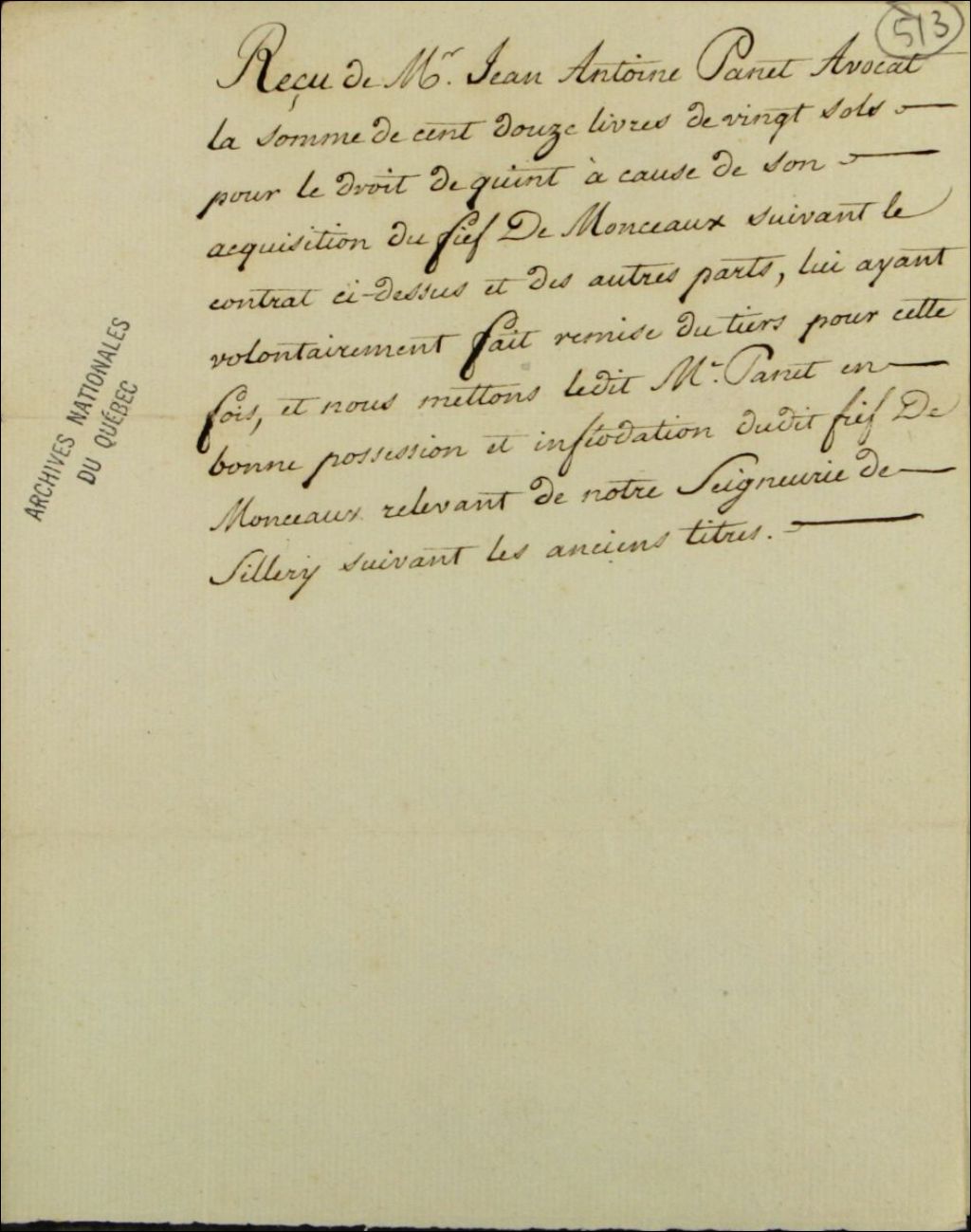 Reçu émis à Jean-Antoine Panet, avocat, pour le droit de quint payé pour l'acquisition de l'arrière-fief de Monceaux relevant de la seigneurie de Sillery, vers 1789, Archives nationales à Québec, Fonds Ministère des Terres et Forêts, (03Q,E21,S64,SS5,SSS7,D513).