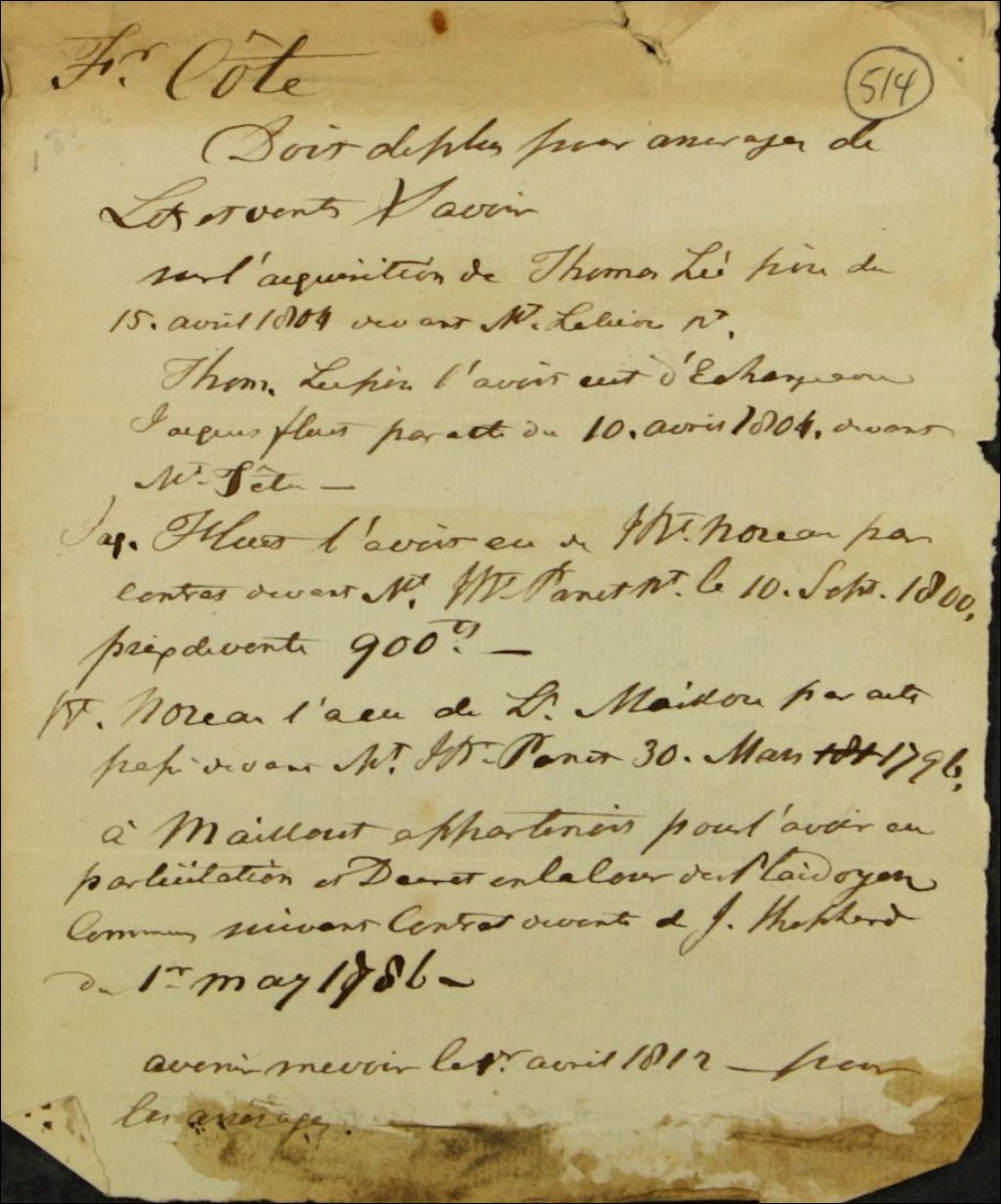 État de compte de François Côté pour des arrérages de lods et ventes, vers 1812, Archives nationales à Québec, Fonds Ministère des Terres et Forêts, (03Q,E21,S64,SS5,SSS7,D514).