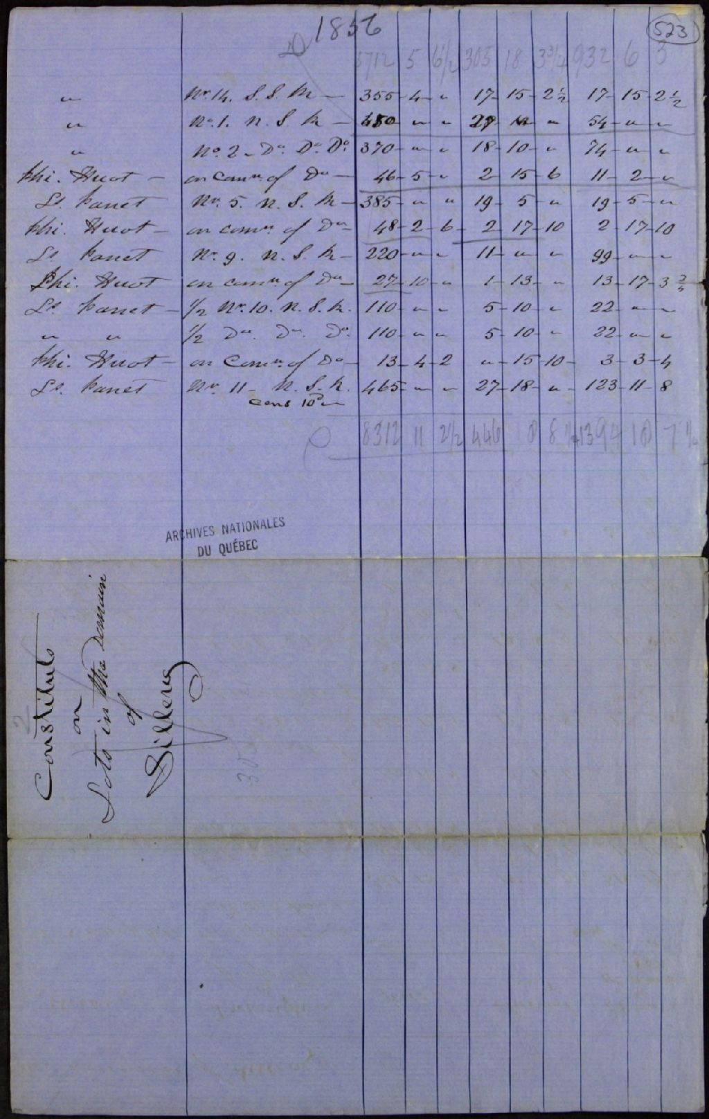 Tableau des constituts (rentes constituées) sur les lots du domaine de Sillery, comprenant le nom du premier concessionnaire, du titulaire actuel, la date de concession, le notaire devant qui l'acte a été passé, une brève description du lot, le prix à l'achat, la rente annuelle et les arrérages au 11 novembre 1856, 11 novembre 1856, Archives nationales à Québec, Fonds Ministère des Terres et Forêts, (03Q,E21,S64,SS5,SSS7,D523).