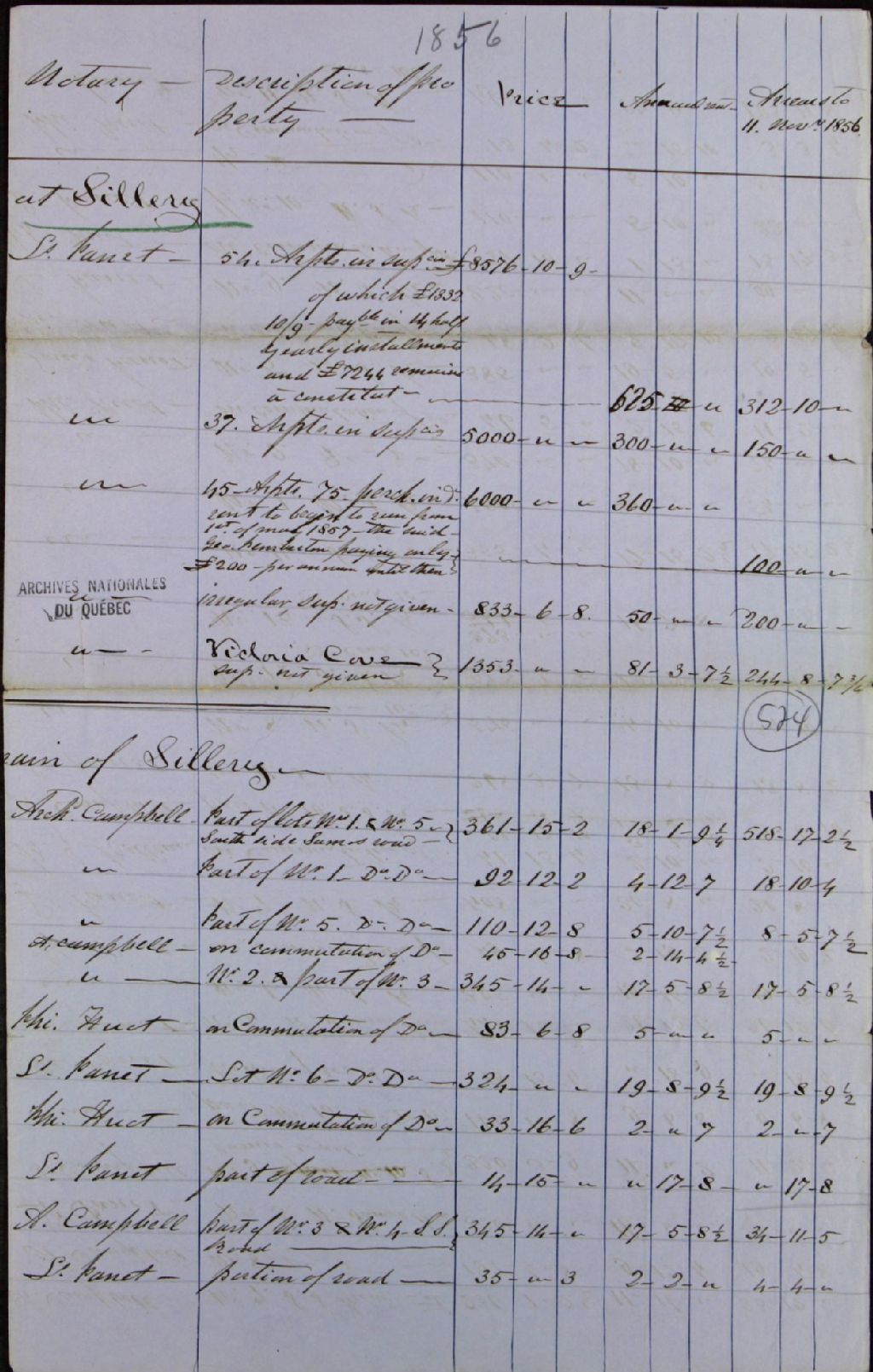 Tableau des constituts (rentes constituées) sur les lots de grève de l'anse de Sillery et du domaine de Sillery comprenant le nom du premier concessionnaire, du titulaire actuel, la date de concession, le notaire devant qui l'acte a été passé, une brève description du lot, le prix à l'achat, la rente annuelle et les arrérages au 11 novembre 1856, 11 novembre 1856, Archives nationales à Québec, Fonds Ministère des Terres et Forêts, (03Q,E21,S64,SS5,SSS7,D524).