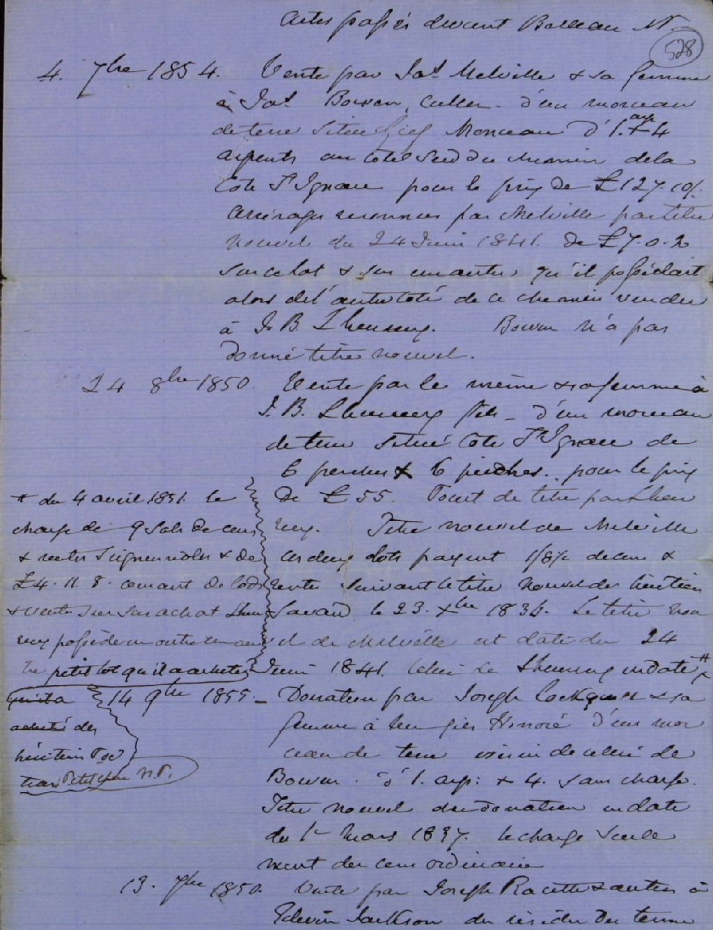 Notes de René-Gabriel Belleau, notaire, concernant des transactions foncières sur des terres et emplacements dans le fief de Monceaux, à l'attention de Charles Panet, écuyer et seigneur de Monceaux, vers 1860, Archives nationales à Québec, Fonds Ministère des Terres et Forêts, (03Q,E21,S64,SS5,SSS7,D528).