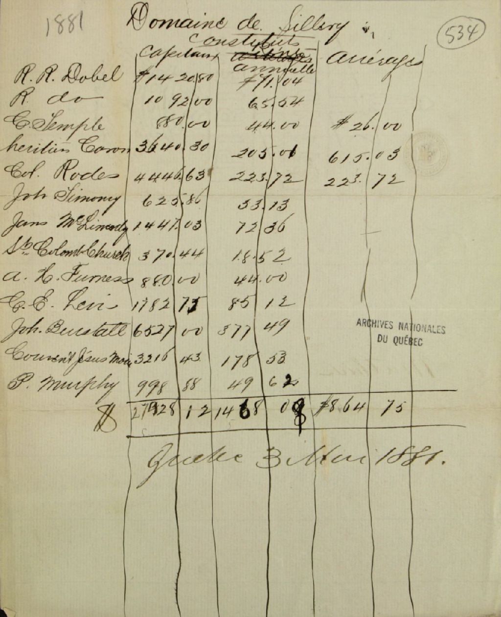 Liste des personnes ayant des constituts (rentes constituées) au domaine de Sillery, 3 mai 1881, Archives nationales à Québec, Fonds Ministère des Terres et Forêts, (03Q,E21,S64,SS5,SSS7,D534).