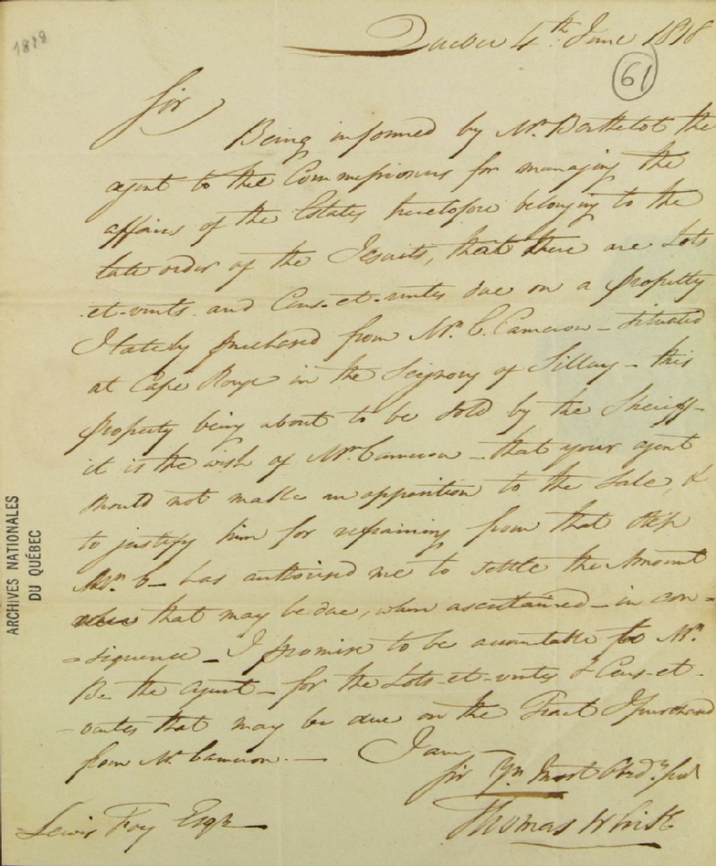 Lettre de Thomas White à Lewis Foy, écuyer, concernant des arrérages de cens et rentes et lots et ventes sur une propriété située au Cap Rouge (Cap-Rouge) dans la seigneurie de Sillery, 4 juin 1818, Archives nationales à Québec, Fonds Ministère des Terres et Forêts, (03Q,E21,S64,SS5,SSS7,D61).