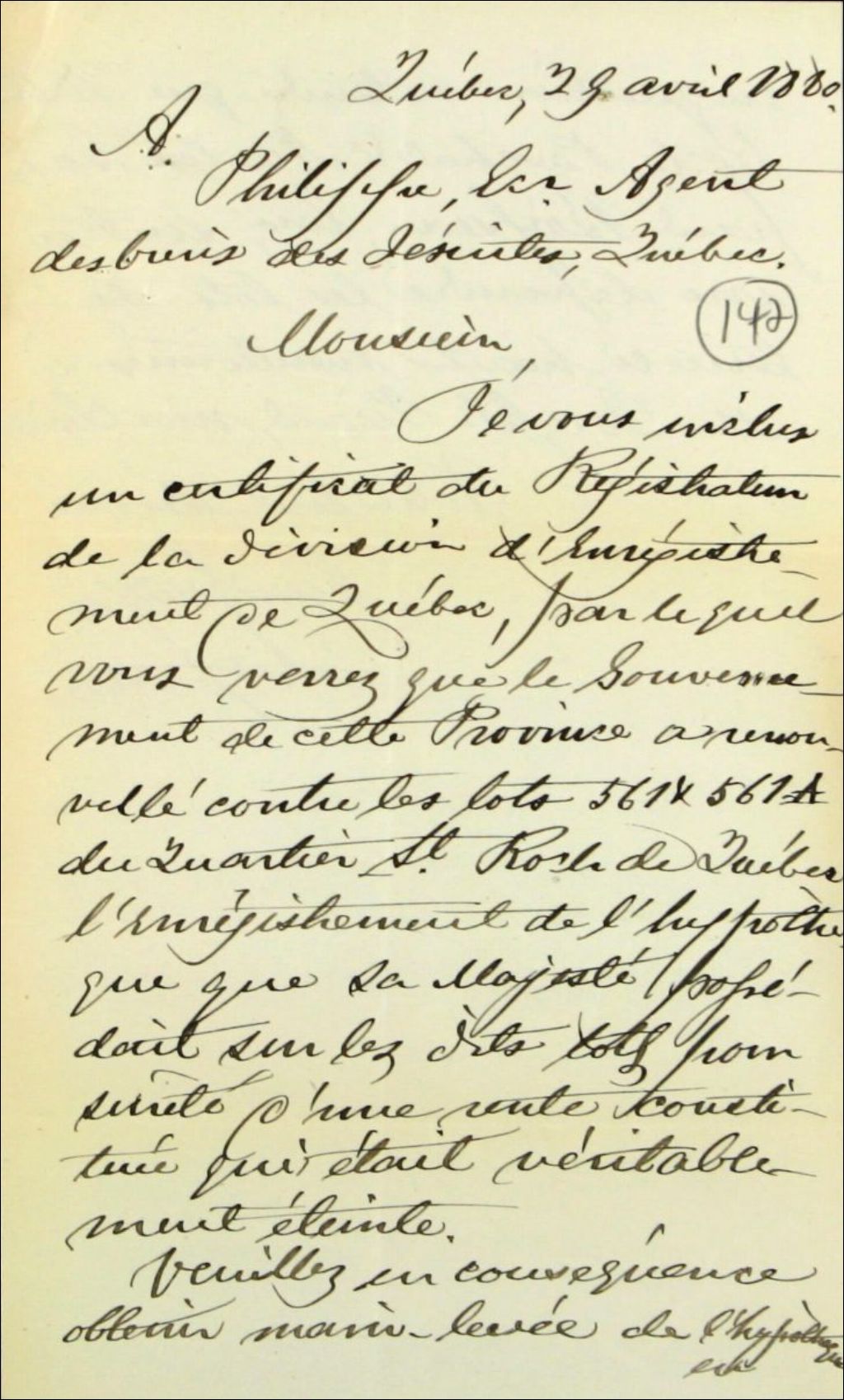 Lettre de Germain Guay, notaire, à Philippe Huot, agent des biens des Jésuites, de la ville de Québec, lui demandant main-levée d'une hypothèque sur les lots 561 et 561A du quartier Saint-Roch-de-Québec, 29 avril 1880, Archives nationales à Québec, Fonds Ministère des Terres et Forêts, (03Q,E21,S64,SS5,SSS8,D142).